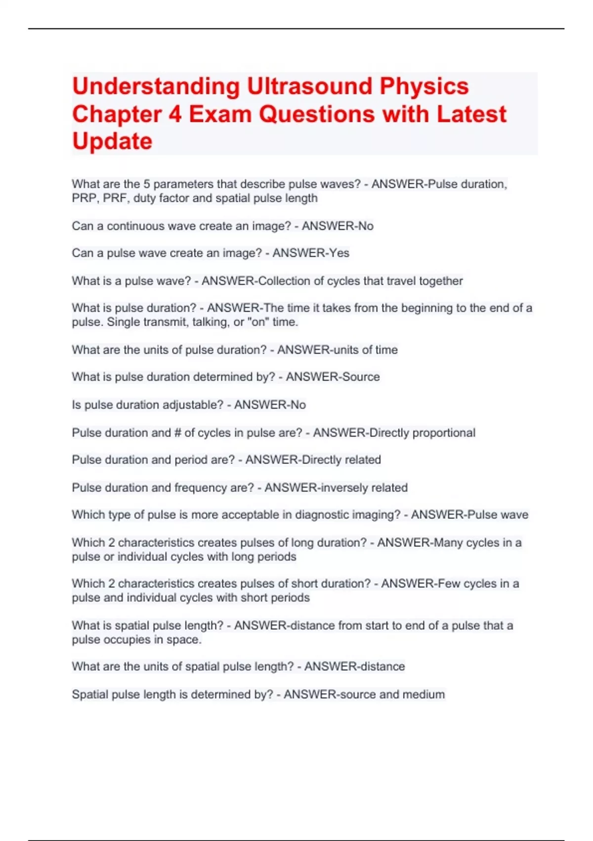 What are the 5 parameters that describe pulse waves? - ANSWER-Pulse duration, PRP, PRF, duty factor and spatial pulse length Can a continuous wave create an image? - ANSWER-No Can a pulse wave create an image? - ANSWER-Yes What is a pulse wave? - ANSWER-Collection of cycles that travel together What is pulse duration? - ANSWER-The time it takes from the beginning to the end of a pulse. Single transmit, talking, or "on" time. What are the units of pulse duration? - ANSWER-units of time What is pulse duration determined by? - ANSWER-Source Is pulse duration adjustable? - ANSWER-No Pulse duration and # of cycles in pulse are? - ANSWER-Directly proportional Pulse duration and period are? - ANSWER-Directly related Pulse duration and frequency are? - ANSWER-inversely related Which type of pulse is more acceptable in diagnostic imaging? - ANSWER-Pulse wave Which 2 characteristics creates pulses of long duration? - ANSWER-Many cycles in a pulse or individual cycles with long periods Which 2 characteristics creates pulses of short duration? - ANSWER-Few cycles in a pulse and individual cycles with short periods What is spatial pulse length? - ANSWER-distance from start to end of a pulse that a pulse occupies in space. What are the units of spatial pulse length? - ANSWER-distance Spatial pulse length is determined by? - ANSWER-source and medium