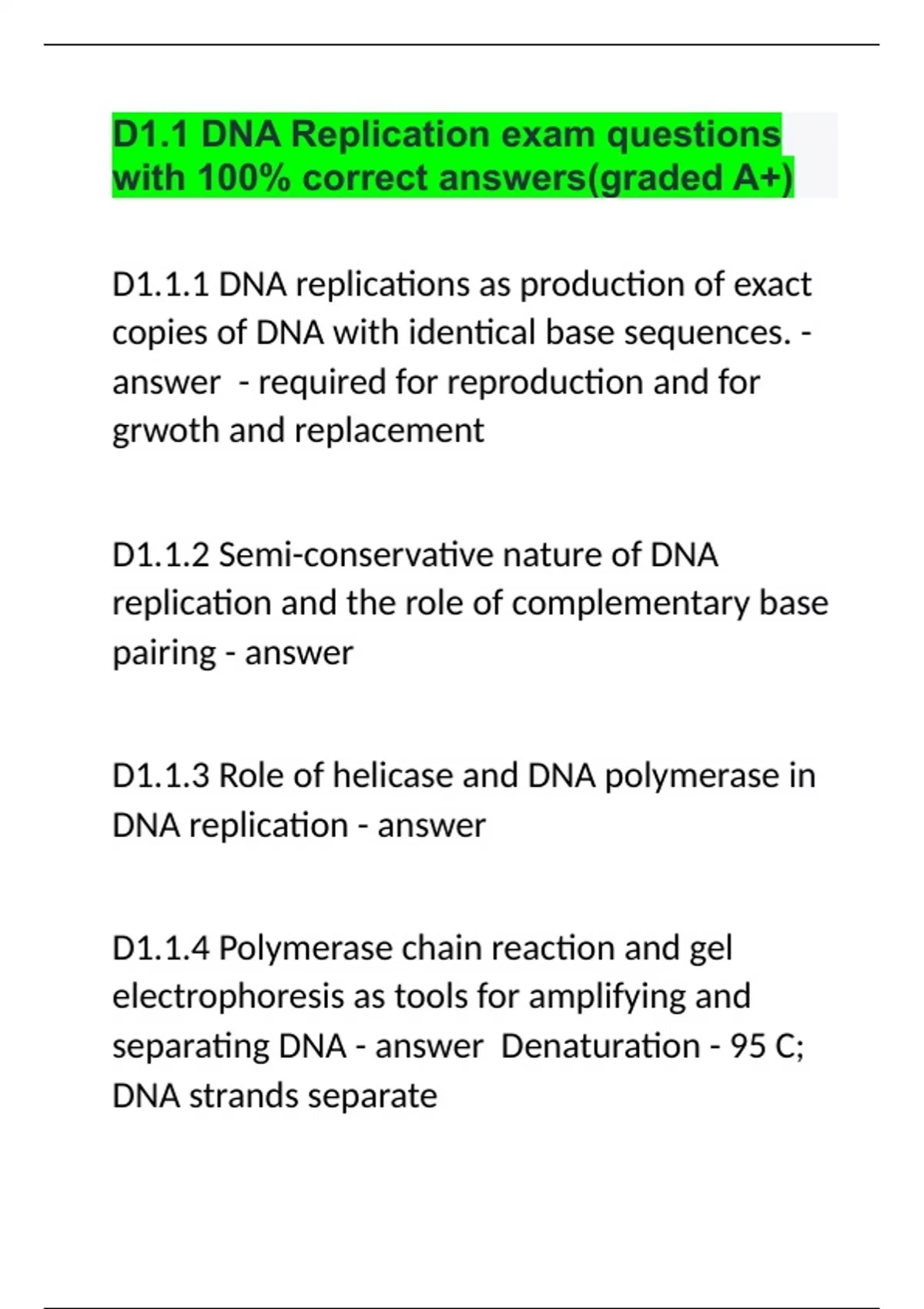 D1.1 DNA Replication exam questions with 100% correct answers(graded A+).