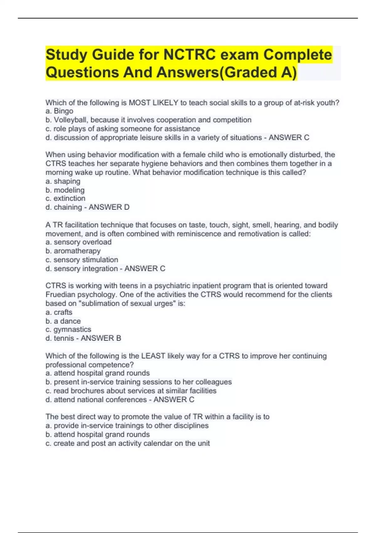 Study Guide for NCTRC exam Complete Which of the following is MOST LIKELY to teach social skills to a group of at-risk youth? a. Bingo b. Volleyball, because it involves cooperation and competition c. role plays of asking someone for assistance d. discussion of appropriate leisure skills in a variety of situations - ANSWER C When using behavior modification with a female child who is emotionally disturbed, the CTRS teaches her separate hygiene behaviors and then combines them together in a morning wake up routine. What behavior modification technique is this called? a. shaping b. modeling c. extinction d. chaining - ANSWER D A TR facilitation technique that focuses on taste, touch, sight, smell, hearing, and bodily movement, and is often combined with reminiscence and remotivation is called: a. sensory overload b. aromatherapy c. sensory stimulation d. sensory integration - ANSWER C CTRS is working with teens in a psychiatric inpatient program that is oriented toward Fruedian psychology. One of the activities the CTRS would recommend for the clients based on "sublimation of sexual urges" is: a. crafts b. a dance c. gymnastics d. tennis - ANSWER B Which of the following is the LEAST likely way for a CTRS to improve her continuing p Questions And Answers(Graded A)