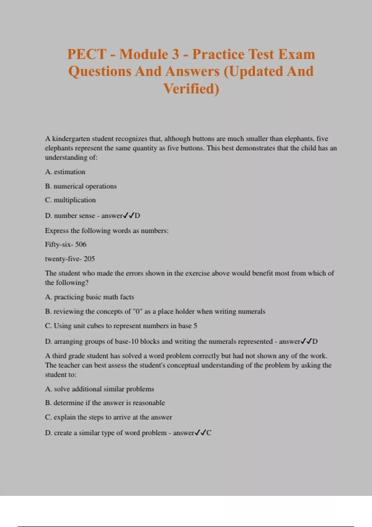 PECT - Module 3 - Practice Test Exam Questions And Answers (Updated And Verified) A kindergarten student recognizes that, although buttons are much smaller than elephants, five elephants represent the same quantity as five buttons. This best demonstrates that the child has an understanding of: A. estimation B. numerical operations C. multiplication D. number sense - answerD Express the following words as numbers: Fifty-six- 506 twenty-five- 205 The student who made the errors shown in the exercise above would benefit most from which of the following? A. practicing basic math facts B. reviewing the concepts of "0" as a place holder when writing numerals C. Using unit cubes to represent numbers in base 5 D. arranging groups of base-10 blocks and writing the numerals represented - answerD A third grade student has solved a word problem correctly but had not shown any of the work. The teacher can best assess the student's conceptual understanding of the problem by asking the student to: A. solve additional similar problems B. determine if the answer is reasonable C. explain the steps to arrive at the answer D. create a similar type of word problem - answerC Which of the following behaviors by a child demonstrates an understanding of one-to-one correspondence? A. placing blue and red balls in separate containers B. identifying objects in a room that comes in pairs C. Counting a group of ten objects by touching each object while saying its number aloud D. matching a puzzle piece with the number five to a puzzle piece with five apples on it - answerC A kindergarten teacher keeps a large calendar on the classroom wall. Each morning, the teacher and the children discuss the weather, and the children decide whether they should place a sun or a cloud on the calendar. Which of the following teacher-led activities would be most effective and developmentally appropriate for integrating math into this science activity? A. creating a weather picture graph and updating it daily B. asking the children to decide each morning whether it is sunnier or cloudier than the day before C. adding a yellow marble to a jar for everyday it is sunny D. recording the daily temperature and correlating it too cloudy and sunny days. - answerA a pair of first-grade uses a 2.5 in. block to measure the length of a table. The students then use a 5in block to measure a different table of the same length. They announce to the teacher that the first table is longer than the second table. The teacher then measures the two tables with a ruler and shows the students that the two tables are the same length. This situation could be most appropriately used for introducing the students to which of the following mathematical concepts? A. geometric shapes B. Standard units of measure C. conservation of number D. perimeter and area - answerB A teacher regularly utilizes peer tutoring in math. The teacher pairs students according to skill level and makes sure that each of the students has a turn in the role of tutor. Which of the following is likely to be the most important benefit of incorporating this type of peer support into instruction? A. increasing students' motivation to learn math content B. prompting students to evaluate their math performance in relation to that of their classmates C. helping students develop efficient and effective study skills in math D. accelerating the pace at which students are able to master math content - answerA. A first-grade teacher who wants to promote students' ability to communicate mathematical ideas should emphasize which of the following teaching practices? A. having students explain their problem-solving strategies orally as part of daily mathematics activities B. helping students create a personal dictionary of mathematical vocabulary C. engaging students in the process of writing their own mathematical word problems. D. providing students with opportunities to complete mathematics activities with a partner or in small group - answerA Which of the following activities would be most appropriate to foster a fourth-grade students' skills in using mathematical language to communicate relationships and concepts A. making a word problem for a classmate to solve that involves an application of the order. B. using flashcards to learn mathematical vocabulary and practice for a quiz. C. explaining why a procedure for multiplication work using place value and properties of operations. D. reading and writing whole number up to one million in words and in number form - answerC In alignment with National Council of teachers of mathematics (NCTM) Principles and standards for school mathematic, elementary mathematics activities A. encourage the use of shortcuts and mnemonic devices to improve fluency B. contribute to a portfolio that students assembles to demonstrate their progress C. incorporate a wide variety of technology to meet the needs pf diverse learners D. foster the development of reasoning, argumentation, and representation - answerD A kindergarten teacher wants students to be able to decompose the number 10 into number pairs. which of the following student activities is likely to be most effective in meeting this objective? A. comparing two sets with quantities less than or equal to ten. B. describing the role of ten in the place value system. C. Solving a series of addition problems with sums equal to ten D. Using number cubes to show how to make ten in more than one way - answerD A teacher would like to provide opportunities for elementary students to make conjectures and construct arguments related to mathematics. Which of the following approaches is likely to be most effective in meeting his goal?