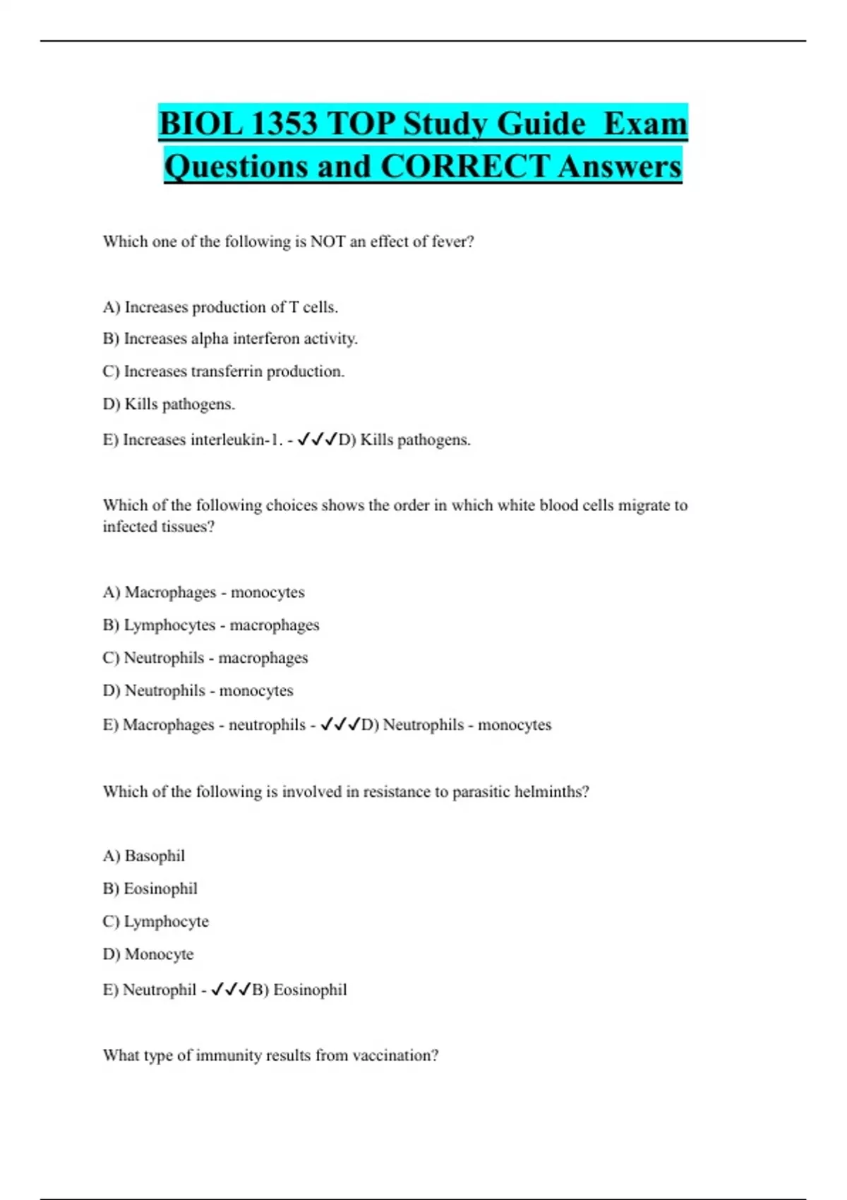 Which one of the following is NOT an effect of fever? A) Increases production of T cells. B) Increases alpha interferon activity. C) Increases transferrin production. D) Kills pathogens. E) Increases interleukin-1. - D) Kills pathogens. Which of the following choices shows the order in which white blood cells migrate to infected tissues? A) Macrophages - monocytes B) Lymphocytes - macrophages C) Neutrophils - macrophages D) Neutrophils - monocytes E) Macrophages - neutrophils - D) Neutrophils - monocytes