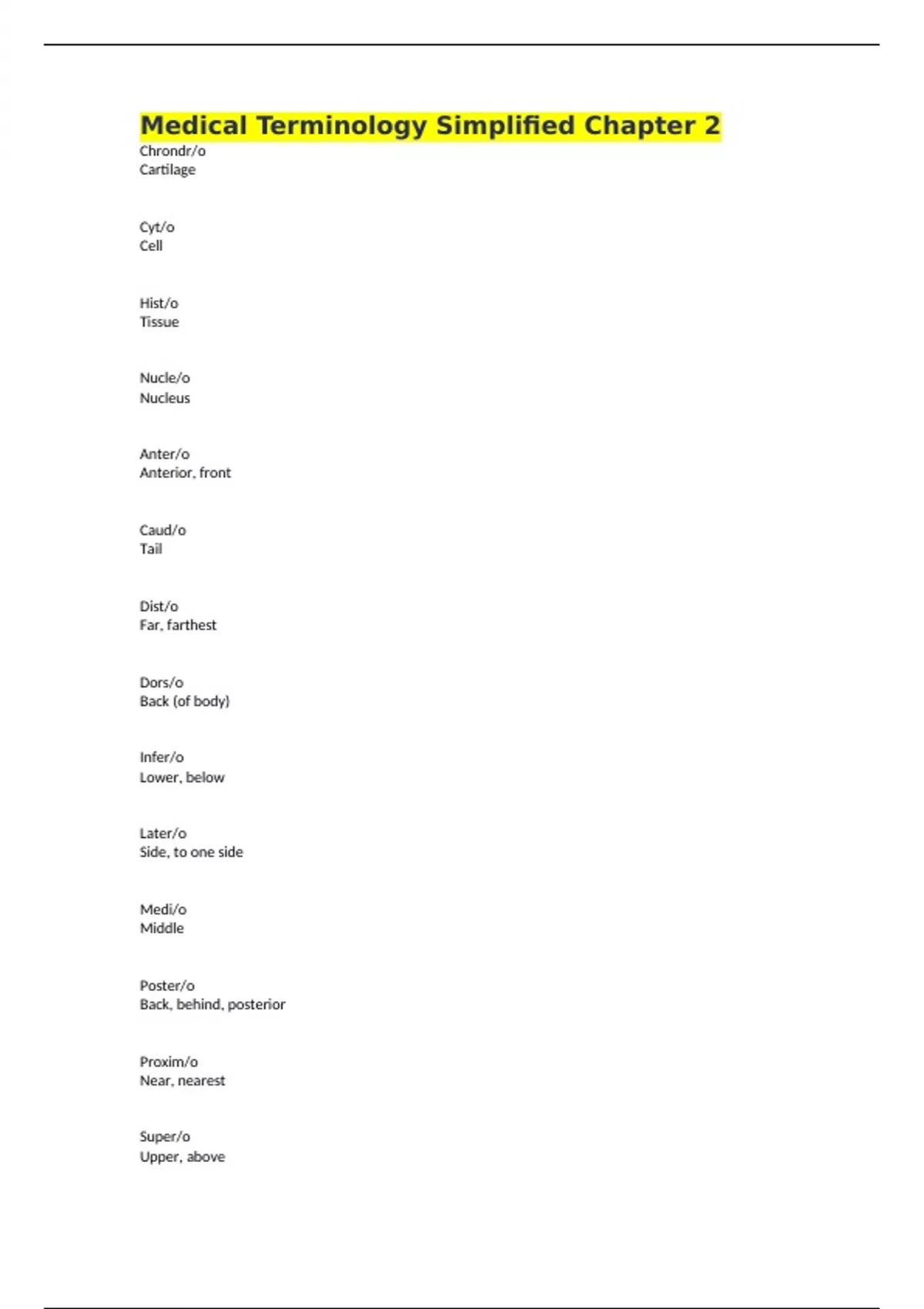 Medical Terminology Simplified Chapter 2 Chrondr/o Cartilage Cyt/o Cell Hist/o Tissue Nucle/o Nucleus Anter/o Anterior, front Caud/o Tail Dist/o Far, farthest Dors/o Back (of body) Infer/o Lower, below Later/o Side, to one side Medi/o Middle Poster/o Back, behind, posterior Proxim/o Near, nearest Super/o Upper, above Ventr/o Belly, belly side