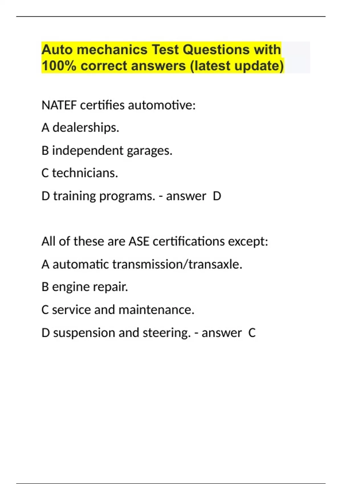 Auto mechanics Test Questions with 100% correct answers (latest update)