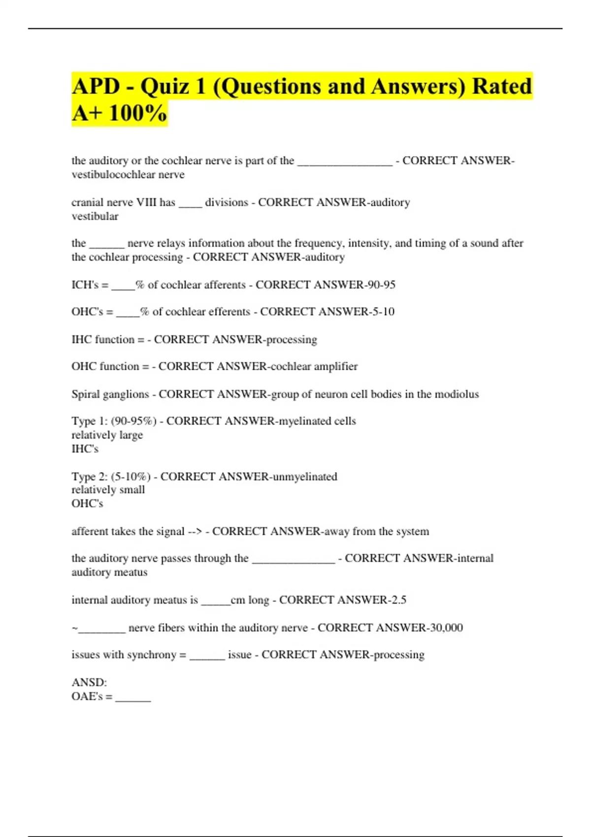 APD - Quiz 1 (Questions and Answers) Rated A+ 100% the auditory or the cochlear nerve is part of the ________________ - CORRECT ANSWER-vestibulocochlear nerve cranial nerve VIII has ____ divisions - CORRECT ANSWER-auditory vestibular the ______ nerve relays information about the frequency, intensity, and timing of a sound after the cochlear processing - CORRECT ANSWER-auditory ICH's = ____% of cochlear afferents - CORRECT ANSWER-90-95 OHC's = ____% of cochlear efferents - CORRECT ANSWER-5-10 IHC function = - CORRECT ANSWER-processing OHC function = - CORRECT ANSWER-cochlear amplifier Spiral ganglions - CORRECT ANSWER-group of neuron cell bodies in the modiolus Type 1: (90-95%) - CORRECT ANSWER-myelinated cells relatively large IHC's Type 2: (5-10%) - CORRECT ANSWER-unmyelinated relatively small OHC's afferent takes the signal --> - CORRECT ANSWER-away from the system the auditory nerve passes through the ______________ - CORRECT ANSWER-internal auditory meatus internal auditory meatus is _____cm long - CORRECT ANSWER-2.5 ~________ nerve fibers within the auditory nerve - CORRECT ANSWER-30,000 issues with synchrony = ______ issue - CORRECT ANSWER-processing ANSD: OAE's = ______ ABR = _______ CM = _______ - CORRECT ANSWER-normal abnormal present