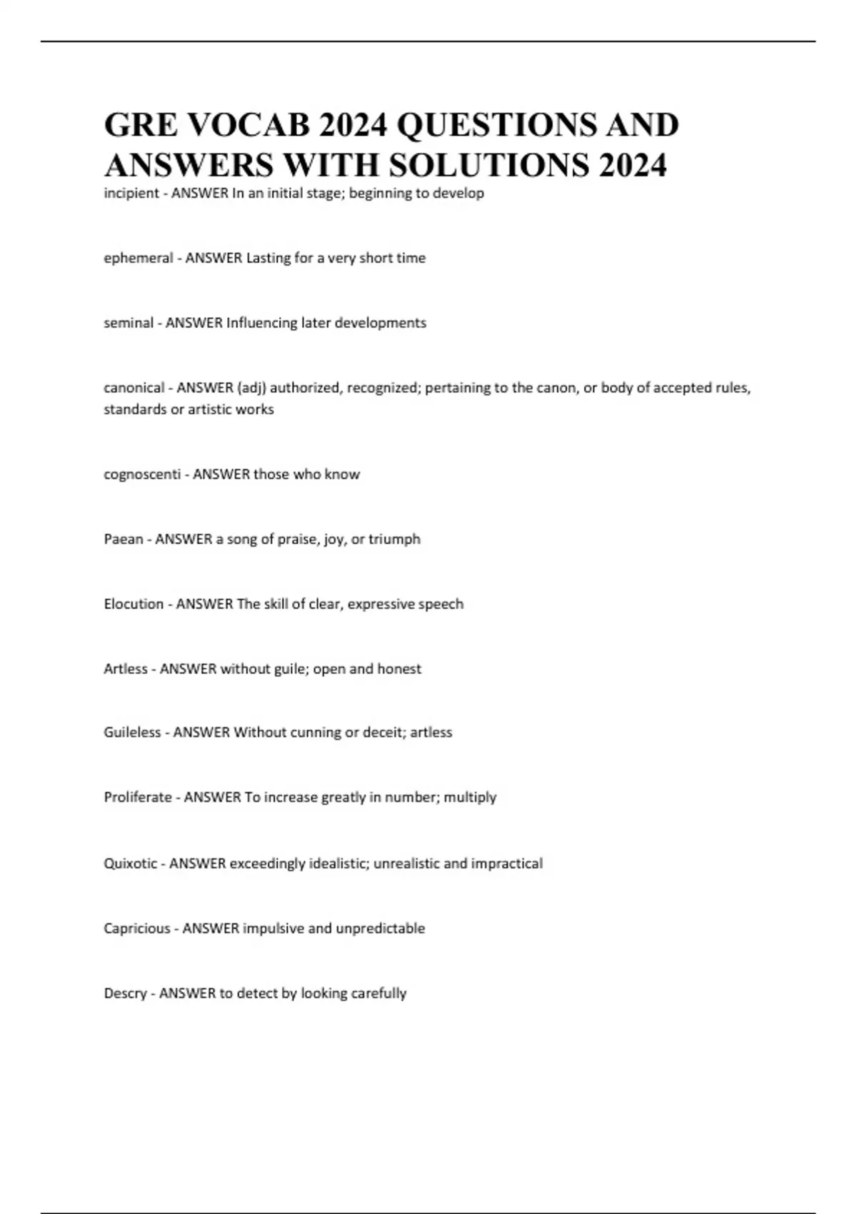 GRE VOCAB 2024 QUESTIONS AND ANSWERS WITH SOLUTIONS 2024