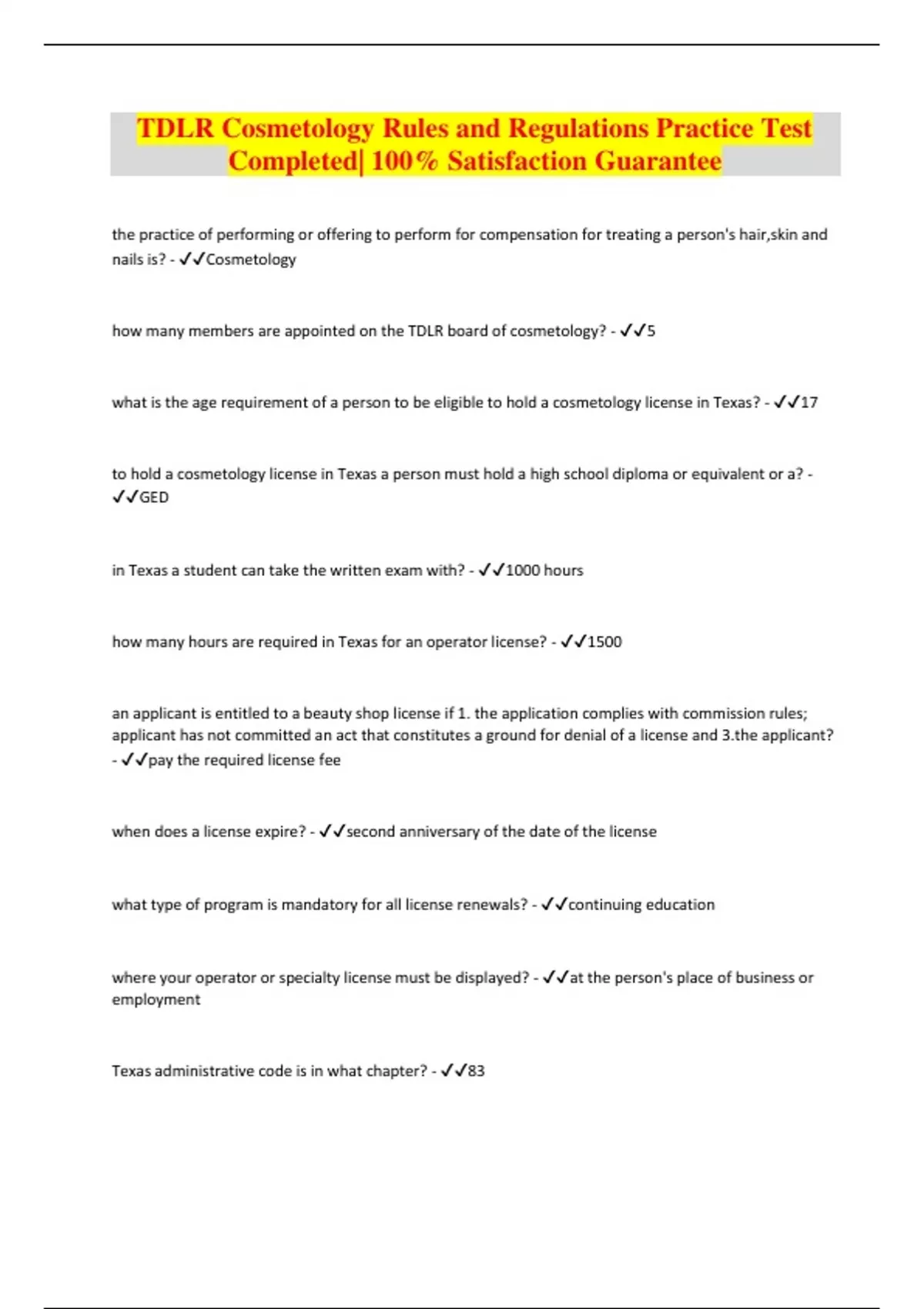 TDLR Cosmetology Rules and Regulations Practice Test Completed| 100% Satisfaction Guarantee