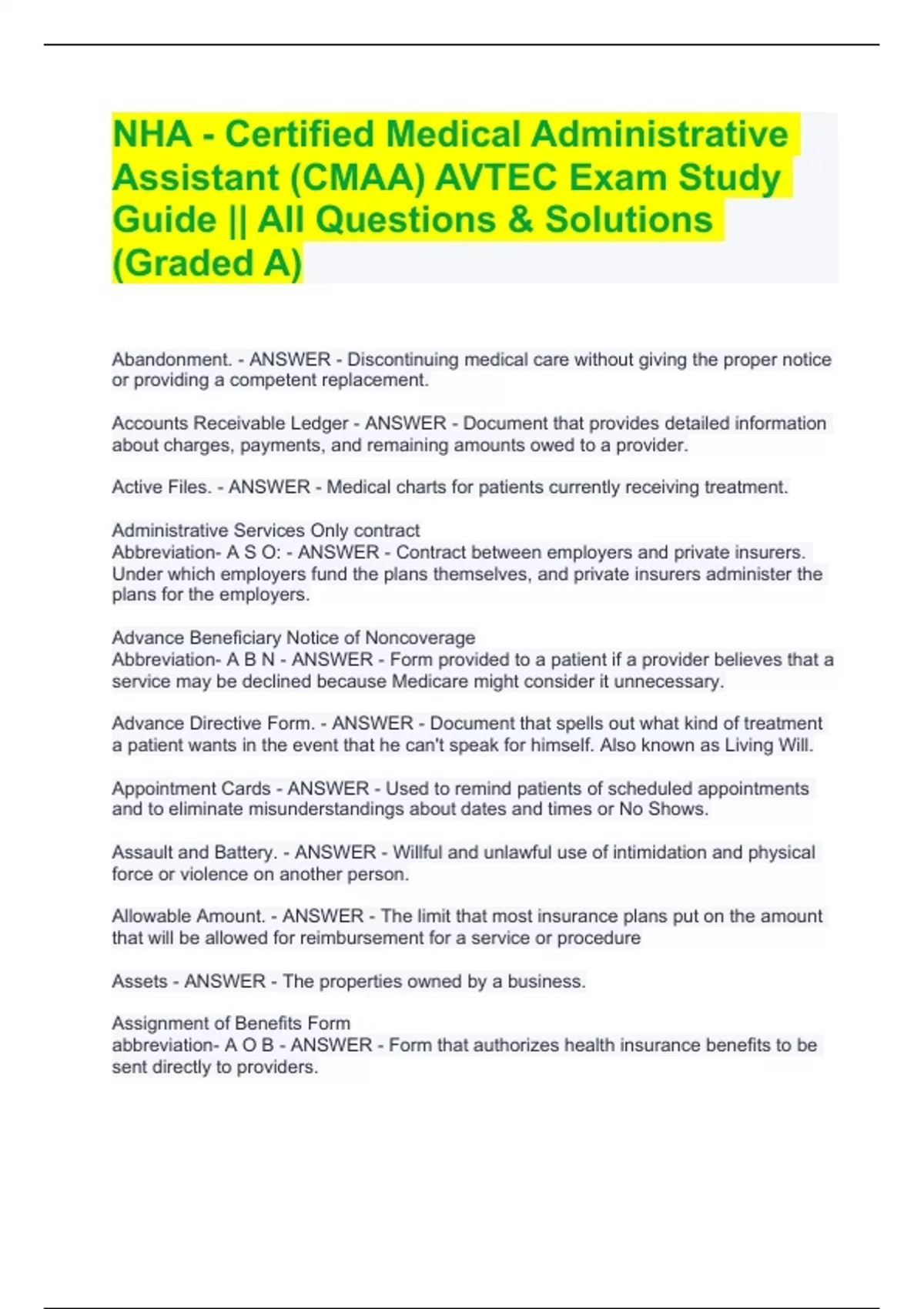 NHA - Certified Medical Administrative Assistant (CMAA) AVTEC Exam Study Guide || All Questions & Solutions (Graded A)NHA - Certified Medical Administrative Assistant (CMAA) AVTEC Exam Study Guide || All Questions & Solutions (Graded A)NHA - Certified Medical Administrative Assistant (CMAA) AVTEC Exam Study Guide || All Questions & Solutions (Graded A)NHA - Certified Medical Administrative Assistant (CMAA) AVTEC Exam Study Guide || All Questions & Solutions (Graded A)Abandonment. - ANSWER - Discontinuing medical care without giving the proper notice or providing a competent replacement. Accounts Receivable Ledger - ANSWER - Document that provides detailed information about charges, payments, and remaining amounts owed to a provider.