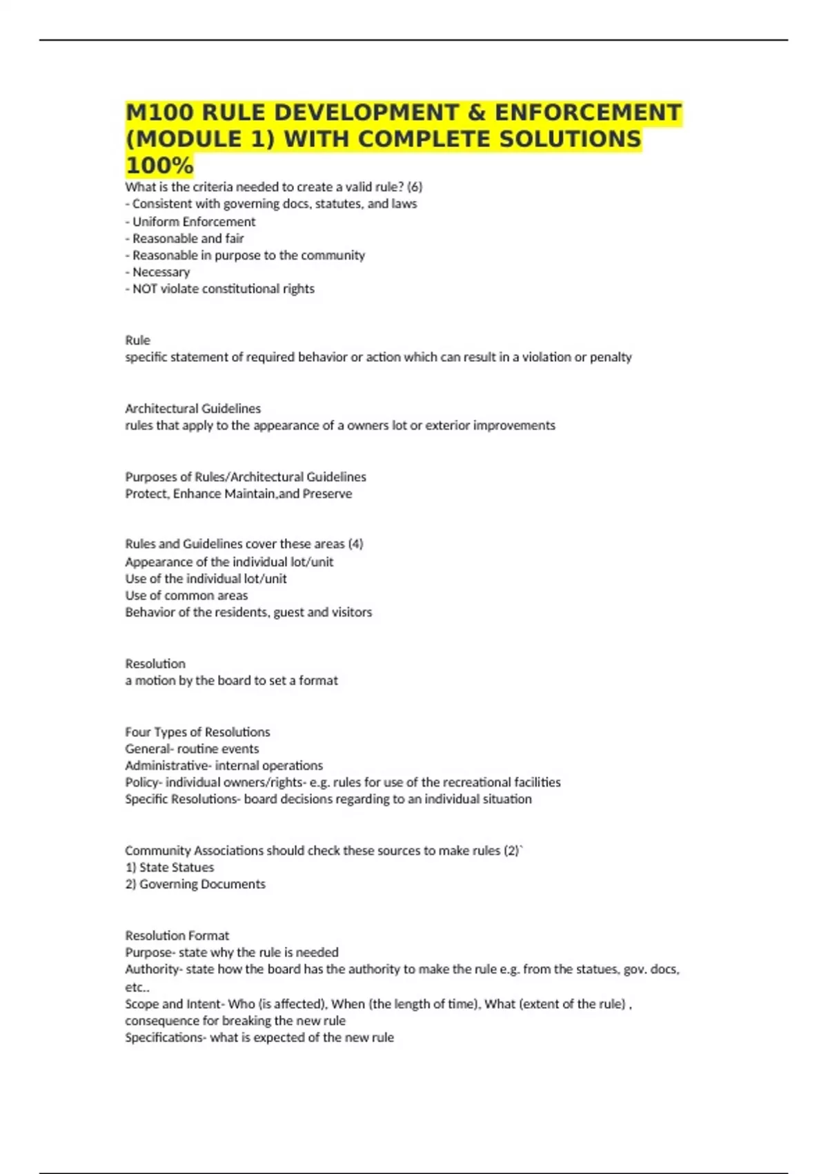 M100 RULE DEVELOPMENT & ENFORCEMENT (MODULE 1) WITH COMPLETE SOLUTIONS 100% What is the criteria needed to create a valid rule? (6) - Consistent with governing docs, statutes, and laws - Uniform Enforcement - Reasonable and fair - Reasonable in purpose to the community - Necessary - NOT violate constitutional rights Rule specific statement of required behavior or action which can result in a violation or penalty Architectural Guidelines rules that apply to the appearance of a owners lot or exterior improvements Purposes of Rules/Architectural Guidelines Protect, Enhance Maintain,and Preserve Rules and Guidelines cover these areas (4) Appearance of the individual lot/unit Use of the individual lot/unit Use of common areas Behavior of the residents, guest and visitors Resolution a motion by the board to set a format Four Types of Resolutions General- routine events Administrative- internal operations Policy- individual owners/rights- e.g. rules for use of the recreational facilities Specific Resolutions- board decisions regarding to an individual situation Community Associations should check these sources to make rules (2)` 1) State Statues 2) Governing Documents Resolution Format Purpose- state why the rule is needed Authority- state how the board has the authority to make the rule e.g. from the statues, gov. docs, etc.. Scope and Intent- Who (is affected), When (the length of time), What (extent of the rule) , consequence for breaking the new rule Specifications- what is expected of the new rule