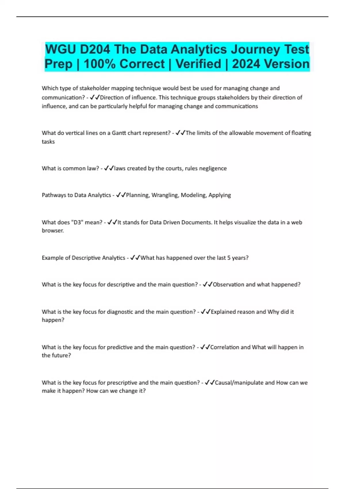 WGU D204 The Data Analytics Journey Test Prep | 100% Correct | Verified | 2024 Version