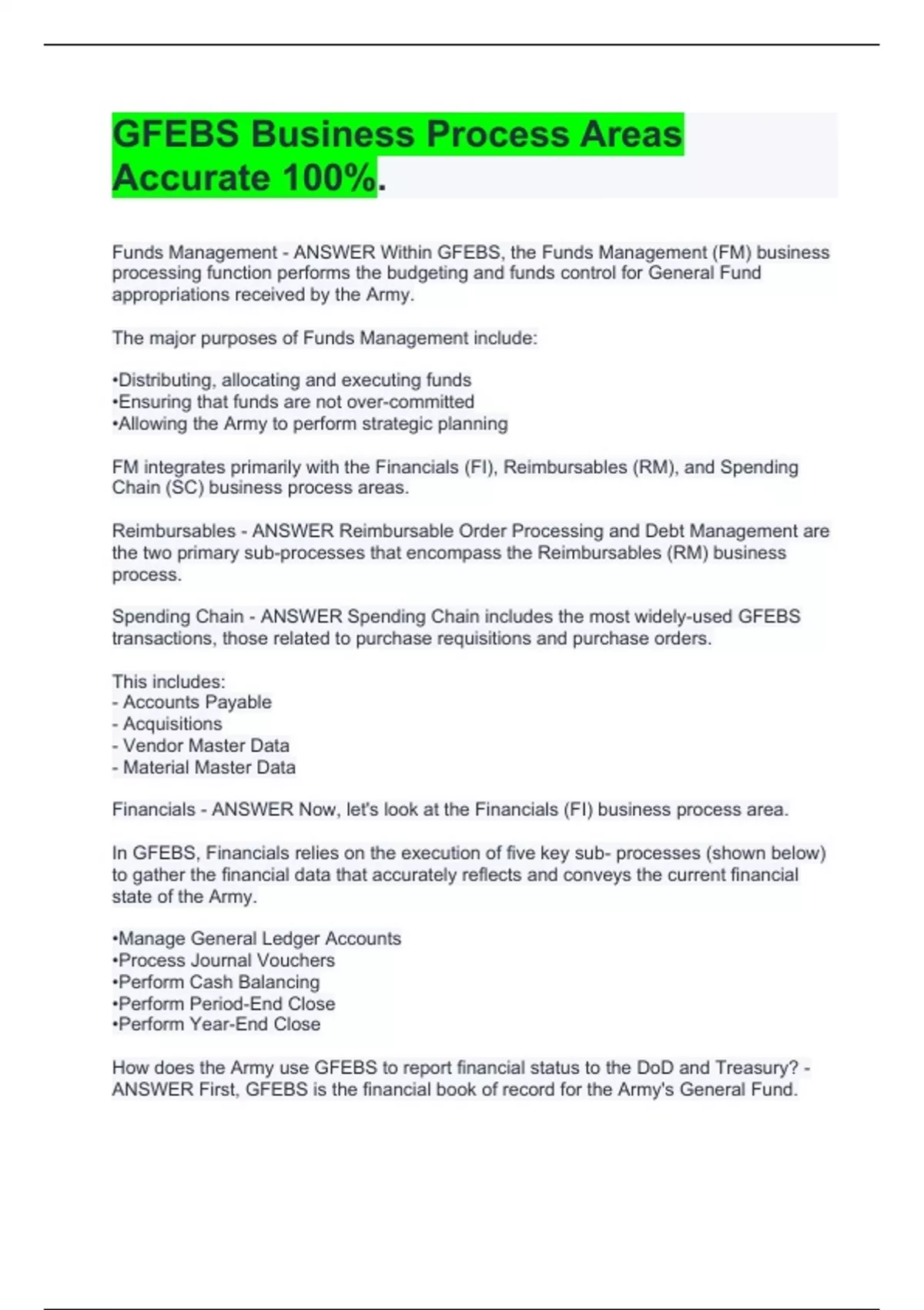 Funds Management - ANSWER Within GFEBS, the Funds Management (FM) business processing function performs the budgeting and funds control for General Fund appropriations received by the Army. The major purposes of Funds Management include: •Distributing, allocating and executing funds •Ensuring that funds are not over-committed •Allowing the Army to perform strategic planning FM integrates primarily with the Financials (FI), Reimbursables (RM), and Spending Chain (SC) business process areas. Reimbursables - ANSWER Reimbursable Order Processing and Debt Management are the two primary sub-processes that encompass the Reimbursables (RM) business process. Spending Chain - ANSWER Spending Chain includes the most widely-used GFEBS transactions, those related to purchase requisitions and purchase orders. This includes: - Accounts Payable - Acquisitions - Vendor Master Data - Material Master Data Financials - ANSWER Now, let's look at the Financials (FI) business process area. In GFEBS, Financials relies on the execution of five key sub- processes (shown below) to gather the financial data that accurately reflects and conveys the current financial state of the Army. •Manage General Ledger Accounts •Process Journal Vouchers •Perform Cash Balancing •Perform Period-End Close •Perform Year-End Close How does the Army use GFEBS to report financial status to the DoD and Treasury? - ANSWER First, GFEBS is the financial book of record for the Army's General Fund. E