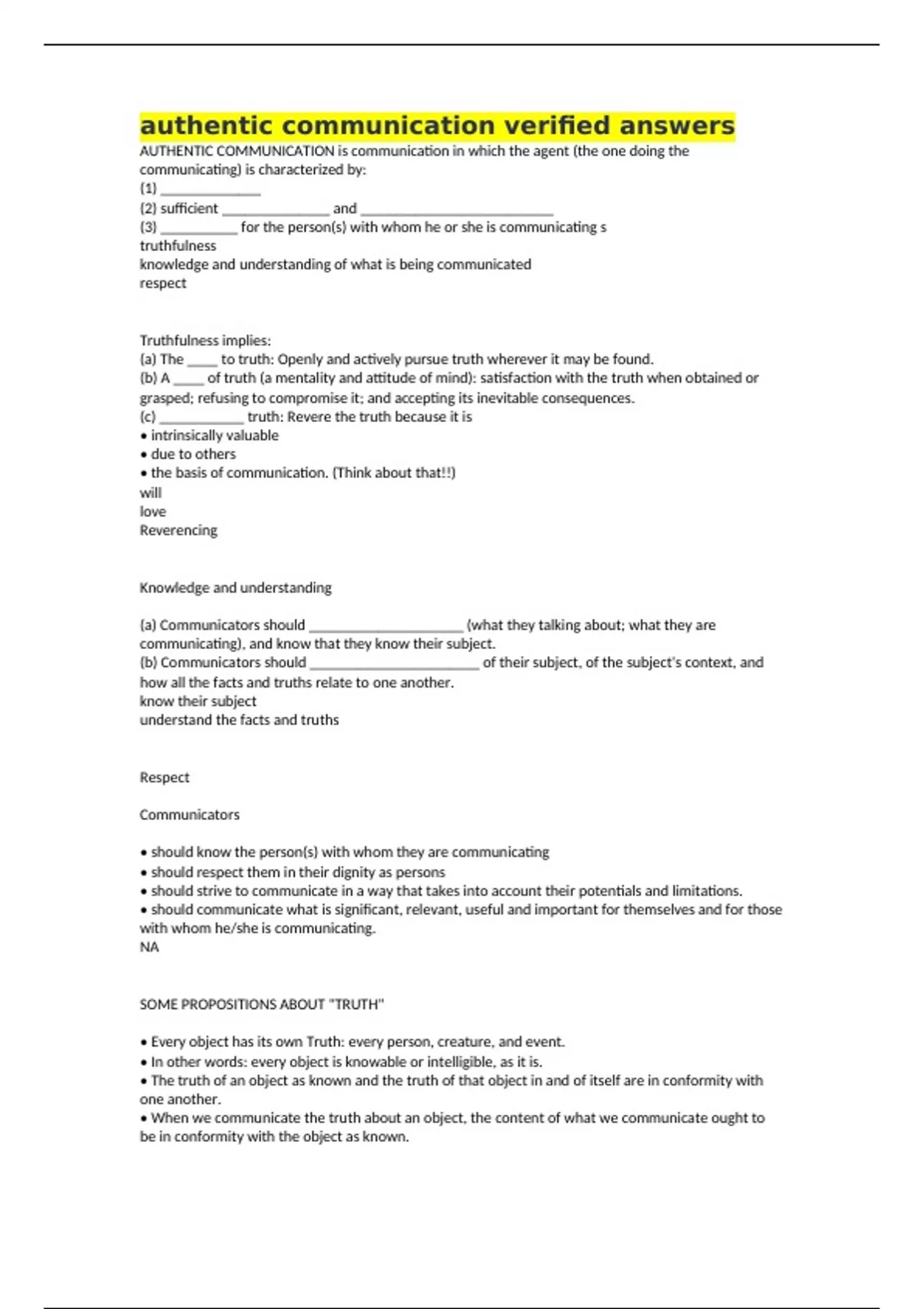 authentic communication verified answers AUTHENTIC COMMUNICATION is communication in which the agent (the one doing the communicating) is characterized by: (1) _____________ (2) sufficient ______________ and _________________________ (3) __________ for the person(s) with whom he or she is communicating s truthfulness knowledge and understanding of what is being communicated respect Truthfulness implies: (a) The ____ to truth: Openly and actively pursue truth wherever it may be found. (b) A ____ of truth (a mentality and attitude of mind): satisfaction with the truth when obtained or grasped; refusing to compromise it; and accepting its inevitable consequences. (c) ___________ truth: Revere the truth because it is • intrinsically valuable • due to others • the basis of communication. (Think about that!!) will love Reverencing Knowledge and understanding (a) Communicators should ____________________ (what they talking about; what they are communicating), and know that they know their subject. (b) Communicators should ______________________ of their subject, of the subject's context, and how all the facts and truths relate to one another. know their subject understand the facts and truths Respect Communicators • should know the person(s) with whom they are communicating • should respect them in their dignity as persons • should strive to communicate in a way that takes into account their potentials and limitations. • should communicate what is significant, relevant, useful and important for themselves and for those with whom he/she is communicating. NA SOME PROPOSITIONS ABOUT "TRUTH" • Every object has its own Truth: every person, creature, and event. • In other words: every object is knowable or intelligible, as it is. • The truth of an object as known and the truth of that object in and of itself are in conformity with one another. • When we communicate the truth about an object, the content of what we communicate ought to be in conformity with the object as known.