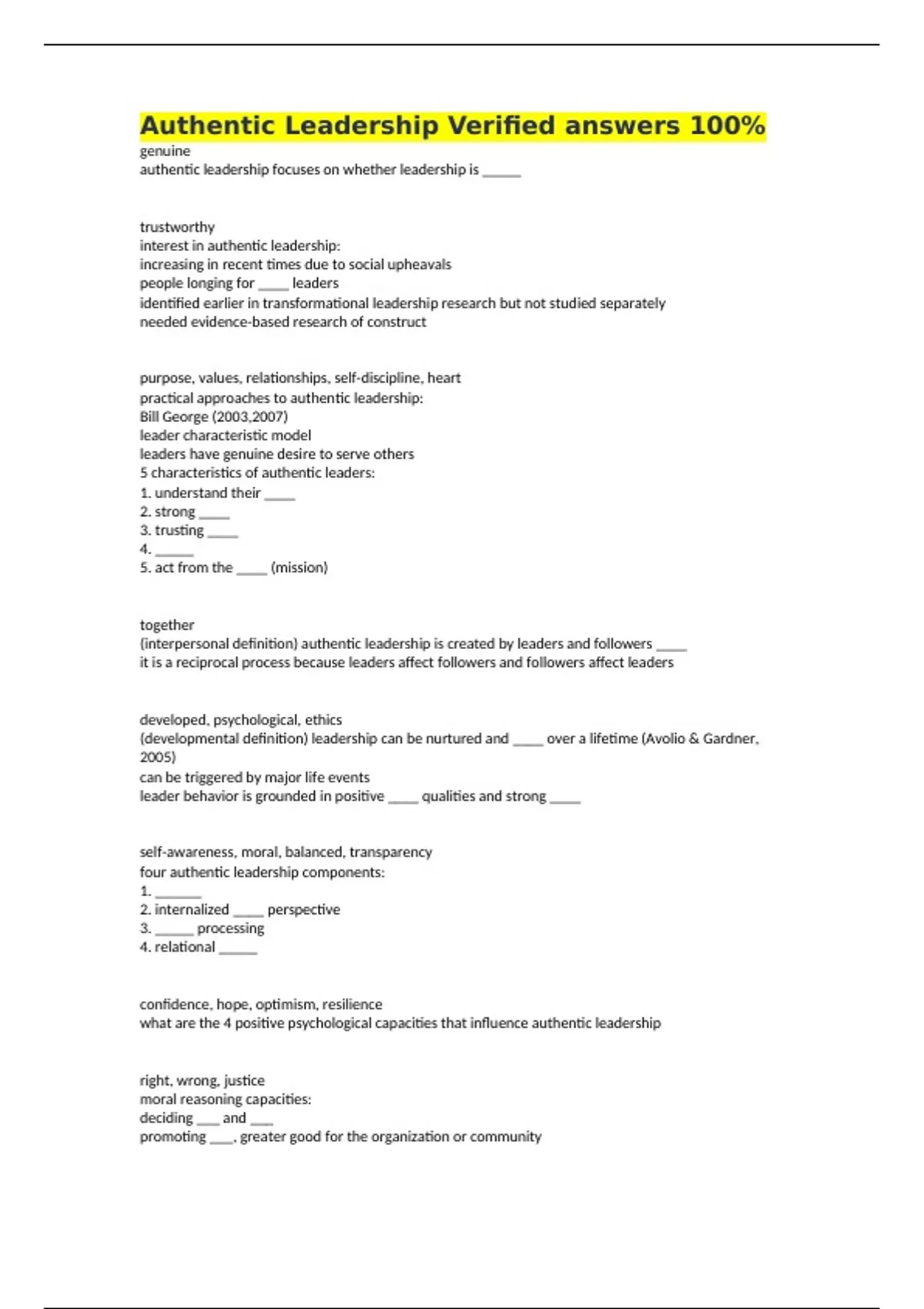 Authentic Leadership Verified answers 100% genuine authentic leadership focuses on whether leadership is _____ trustworthy interest in authentic leadership: increasing in recent times due to social upheavals people longing for ____ leaders identified earlier in transformational leadership research but not studied separately needed evidence-based research of construct purpose, values, relationships, self-discipline, heart practical approaches to authentic leadership: Bill George (2003,2007) leader characteristic model leaders have genuine desire to serve others 5 characteristics of authentic leaders: 1. understand their ____ 2. strong ____ 3. trusting ____ 4. _____ 5. act from the ____ (mission) together (interpersonal definition) authentic leadership is created by leaders and followers ____ it is a reciprocal process because leaders affect followers and followers affect leaders developed, psychological, ethics (developmental definition) leadership can be nurtured and ____ over a lifetime (Avolio & Gardner, 2005) can be triggered by major life events leader behavior is grounded in positive ____ qualities and strong ____ self-awareness, moral, balanced, transparency four authentic leadership components: 1. ______ 2. internalized ____ perspective 3. _____ processing 4. relational _____ confidence, hope, optimism, resilience what are the 4 positive psychological capacities that influence authentic leadership right, wrong, justice moral reasoning capacities: deciding ___ and ___ promoting ___, greater good for the organization or community