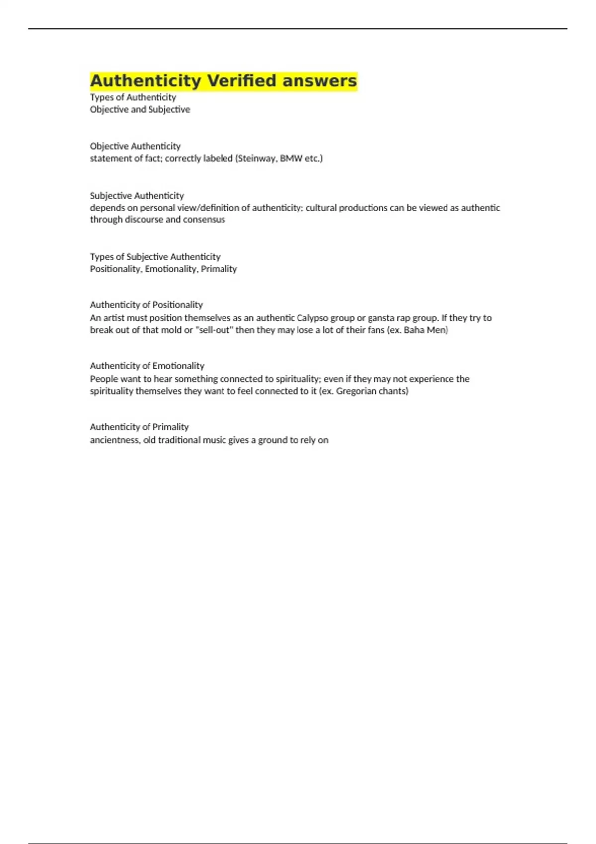 Authenticity Verified answers Types of Authenticity Objective and Subjective Objective Authenticity statement of fact; correctly labeled (Steinway, BMW etc.) Subjective Authenticity depends on personal view/definition of authenticity; cultural productions can be viewed as authentic through discourse and consensus Types of Subjective Authenticity Positionality, Emotionality, Primality Authenticity of Positionality An artist must position themselves as an authentic Calypso group or gansta rap group. If they try to break out of that mold or "sell-out" then they may lose a lot of their fans (ex. Baha Men) Authenticity of Emotionality People want to hear something connected to spirituality; even if they may not experience the spirituality themselves they want to feel connected to it (ex. Gregorian chants) Authenticity of Primality ancientness, old traditional music gives a ground to rely on
