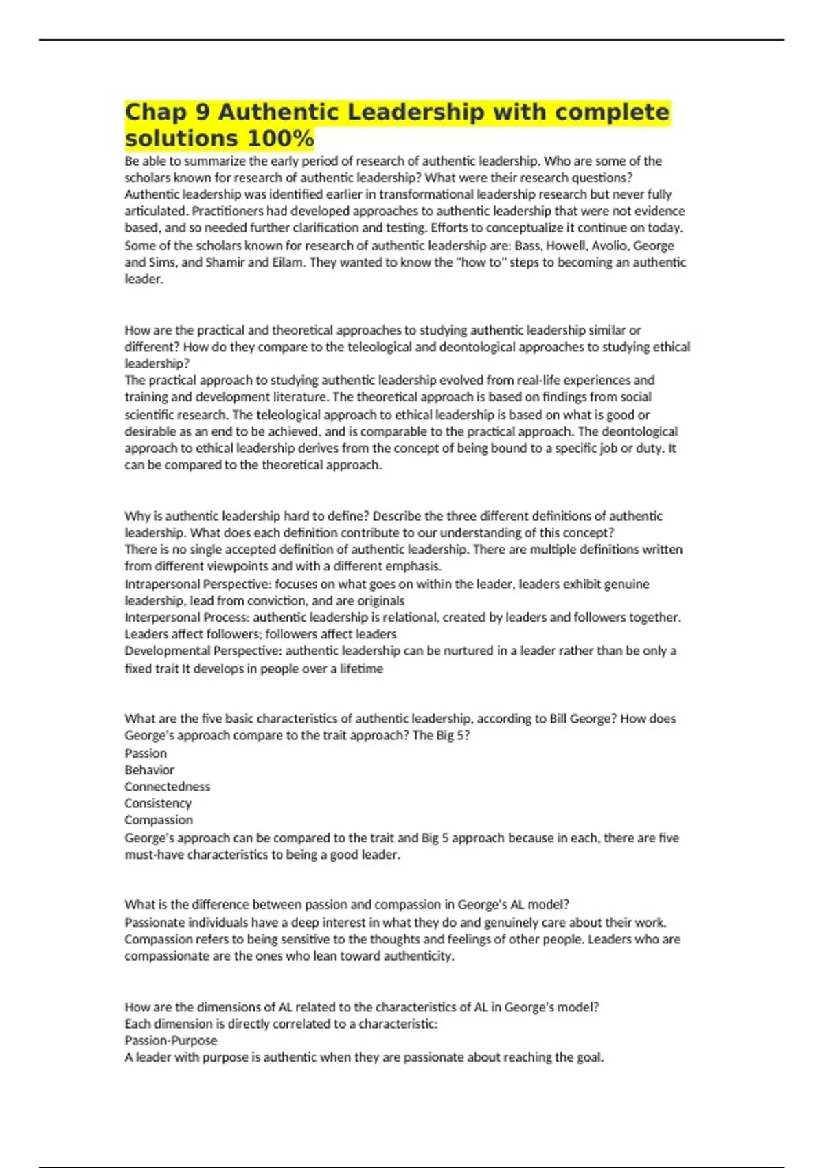 Chap 9 Authentic Leadership with complete solutions 100% Be able to summarize the early period of research of authentic leadership. Who are some of the scholars known for research of authentic leadership? What were their research questions? Authentic leadership was identified earlier in transformational leadership research but never fully articulated. Practitioners had developed approaches to authentic leadership that were not evidence based, and so needed further clarification and testing. Efforts to conceptualize it continue on today. Some of the scholars known for research of authentic leadership are: Bass, Howell, Avolio, George and Sims, and Shamir and Eilam. They wanted to know the "how to" steps to becoming an authentic leader. How are the practical and theoretical approaches to studying authentic leadership similar or different? How do they compare to the teleological and deontological approaches to studying ethical leadership? The practical approach to studying authentic leadership evolved from real-life experiences and training and development literature. The theoretical approach is based on findings from social scientific research. The teleological approach to ethical leadership is based on what is good or desirable as an end to be achieved, and is comparable to the practical approach. The deontological approach to ethical leadership derives from the concept of being bound to a specific job or duty. It can be compared to the theoretical approach. Why is authentic leadership hard to define? Describe the three different definitions of authentic leadership. What does each definition contribute to our understanding of this concept? There is no single accepted definition of authentic leadership. There are multiple definitions written from different viewpoints and with a different emphasis. Intrapersonal Perspective: focuses on what goes on within the leader, leaders exhibit genuine leadership, lead from conviction, and are originals Interpersonal Process: authentic leadership is relational, created by leaders and followers together. Leaders affect followers; followers affect leaders Developmental Perspective: authentic leadership can be nurtured in a leader rather than be only a fixed trait It develops in people over a lifetime What are the five basic characteristics of authentic leadership, according to Bill George? How does George's approach compare to the trait approach? The Big 5? Passion Behavior Connectedness Consistency Compassion George's approach can be compared to the trait and Big 5 approach because in each, there are five must-have characteristics to being a good leader. What is the difference between passion and compassion in George's AL model? Passionate individuals have a deep interest in what they do and genuinely care about their work. Compassion refers to being sensitive to the thoughts and feelings of other people. Leaders who are compassionate are the ones who lean toward authenticity. How are the dimensions of AL related to the characteristics of AL in George's model? Each dimension is directly correlated to a characteristic: Passion-Purpose A leader with purpose is authentic when they are passionate about reaching the goal.