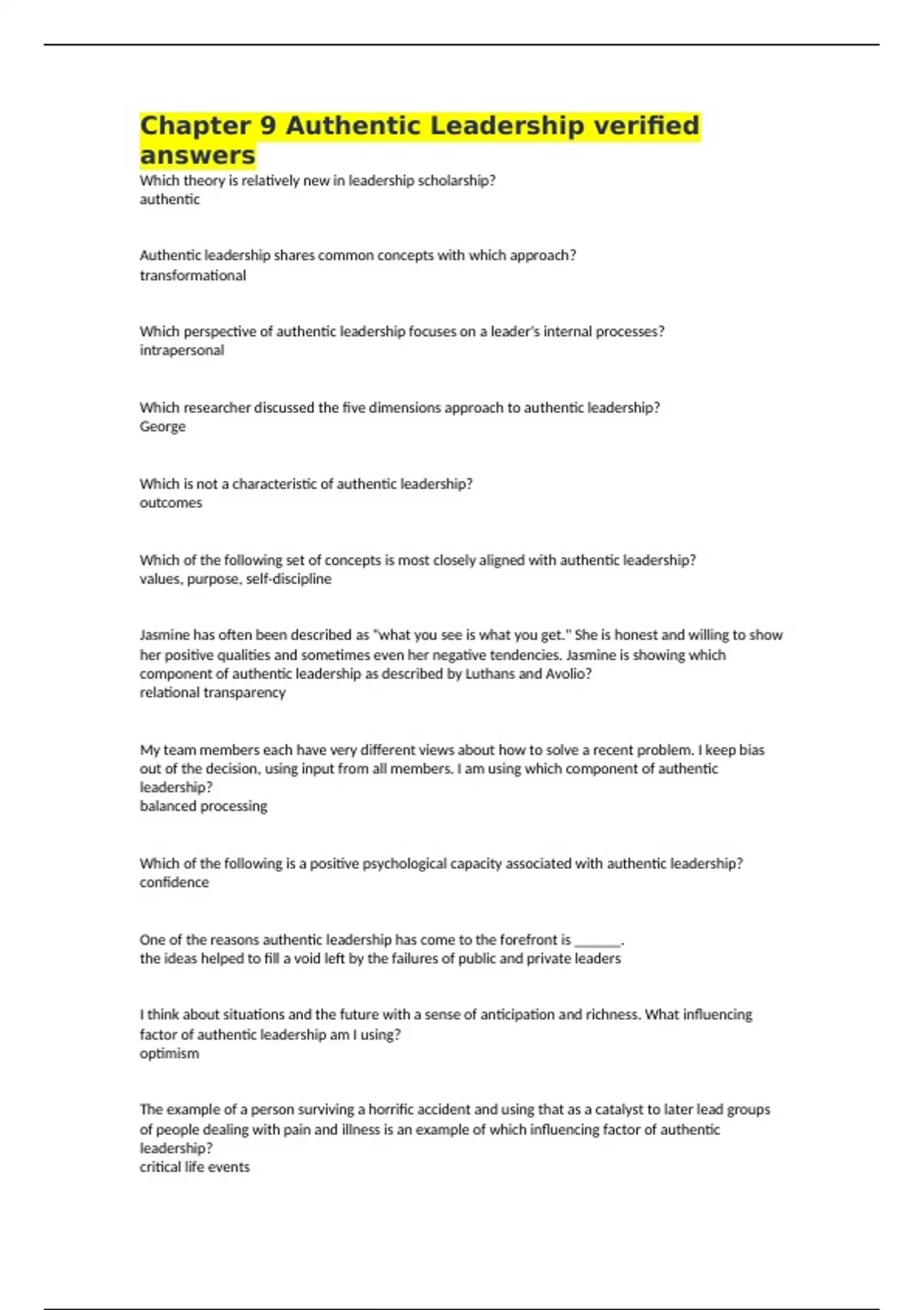 Chapter 9 Authentic Leadership verified answers