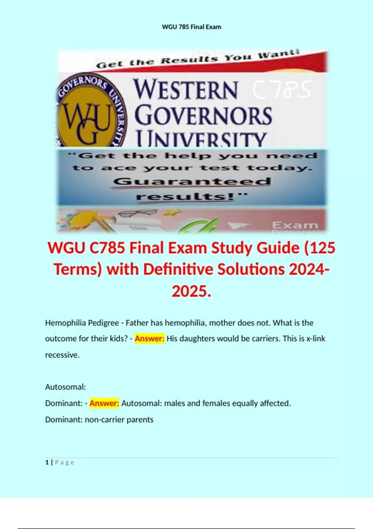 WGU C785 Final Exam Study Guide (125 Terms) with Definitive Solutions . Contains terms like: Hemophilia Pedigree - Father has hemophilia, mother does not. What is the outcome for their kids? - Answer: His daughters would be carriers. This is x-link recessive.