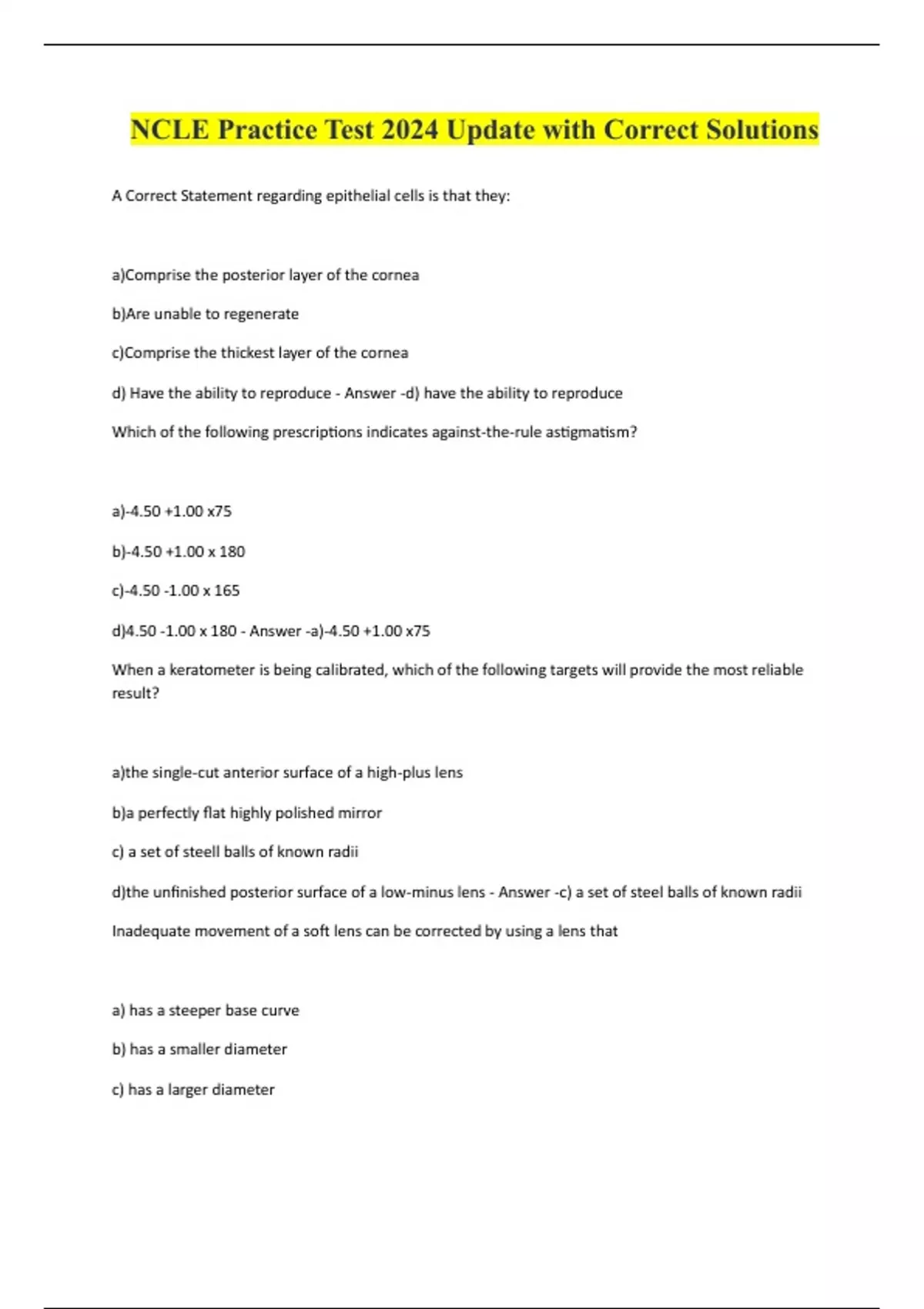 NCLE Practice Test 2024 Update with Correct Solutions A Correct Statement regarding epithelial cells is that they: a)Comprise the posterior layer of the cornea b)Are unable to regenerate c)Comprise the thickest layer of the cornea d) Have the ability to reproduce - Answer -d) have the ability to reproduce Which of the following prescriptions indicates against-the-rule astigmatism? a)-4.50 +1.00 x75 b)-4.50 +1.00 x 180 c)-4.50 -1.00 x 165 d)4.50 -1.00 x 180 - Answer -a)-4.50 +1.00 x75 When a keratometer is being calibrated, which of the following targets will provide the most reliable result? a)the single-cut anterior surface of a high-plus lens b)a perfectly flat highly polished mirror c) a set of steell balls of known radii d)the unfinished posterior surface of a low-minus lens - Answer -c) a set of steel balls of known radii Inadequate movement of a soft lens can be corrected by using a lens that a) has a steeper base curve b) has a smaller diameter c) has a larger diameterd) has a higher water content - Answer -b)has a smaller diameter A long-term, successful, hydrogel contact lens wearer suddenly develops dry eyes. Which of the following is most likely to cause this problem? a) Use of oxidative solution b) use of rewetting drops c) use of anti-histamines d) Wearing of lenses in the wrong eyes - Answer -c) use of anti-histam