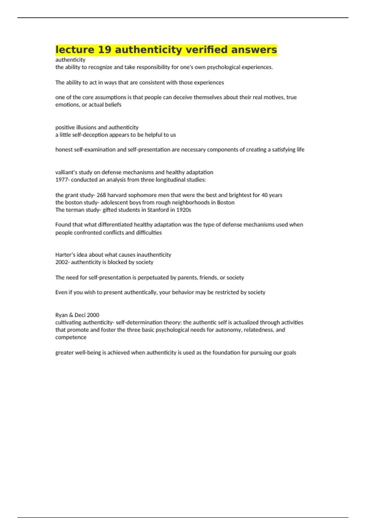 lecture 19 authenticity verified answers authenticity the ability to recognize and take responsibility for one's own psychological experiences. The ability to act in ways that are consistent with those experiences one of the core assumptions is that people can deceive themselves about their real motives, true emotions, or actual beliefs positive illusions and authenticity a little self-deception appears to be helpful to us honest self-examination and self-presentation are necessary components of creating a satisfying life valliant's study on defense mechanisms and healthy adaptation 1977- conducted an analysis from three longitudinal studies: the grant study- 268 harvard sophomore men that were the best and brightest for 40 years the boston study- adolescent boys from rough neighborhoods in Boston The terman study- gifted students in Stanford in 1920s Found that what differentiated healthy adaptation was the type of defense mechanisms used when people confronted conflicts and difficulties Harter's idea about what causes inauthenticity 2002- authenticity is blocked by society The need for self-presentation is perpetuated by parents, friends, or society Even if you wish to present authentically, your behavior may be restricted by society Ryan & Deci 2000 cultivating authenticity- self-determination theory: the authentic self is actualized through activities that promote and foster the three basic psychological needs for autonomy, relatedness, and competence greater well-being is achieved when authenticity is used as the foundation for pursuing our goals