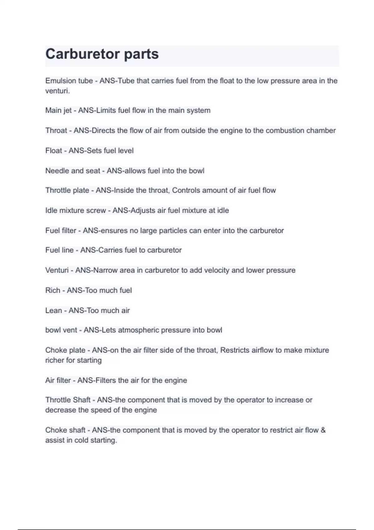 Exam of 1 pages for the course hutex at hutex (Carburetor parts)