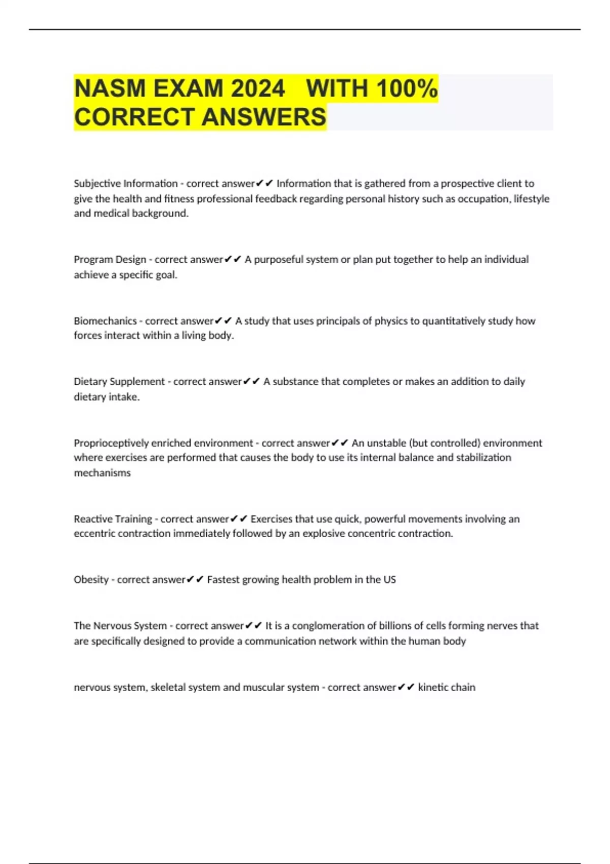 NASM EXAM 2024 WITH 100% CORRECT ANSWERS Subjective Information - correct answer Information that is gathered from a prospective client to give the health and fitness professional feedback regarding personal history such as occupation, lifestyle and medical background. Program Design - correct answer A purposeful system or plan put together to help an individual achieve a specific goal. Biomechanics - correct answer A study that uses principals of physics to quantitatively study how forces interact within a living body. Dietary Supplement - correct answer A substance that completes or makes an addition to daily dietary intake. Proprioceptively enriched environment - correct answer An unstable (but controlled) environment where exercises are performed that causes the body to use its internal balance and stabilization mechanisms Reactive Training - correct answer Exercises that use quick, powerful movements involving an eccentric contraction immediately followed by an explosive concentric contraction. Obesit