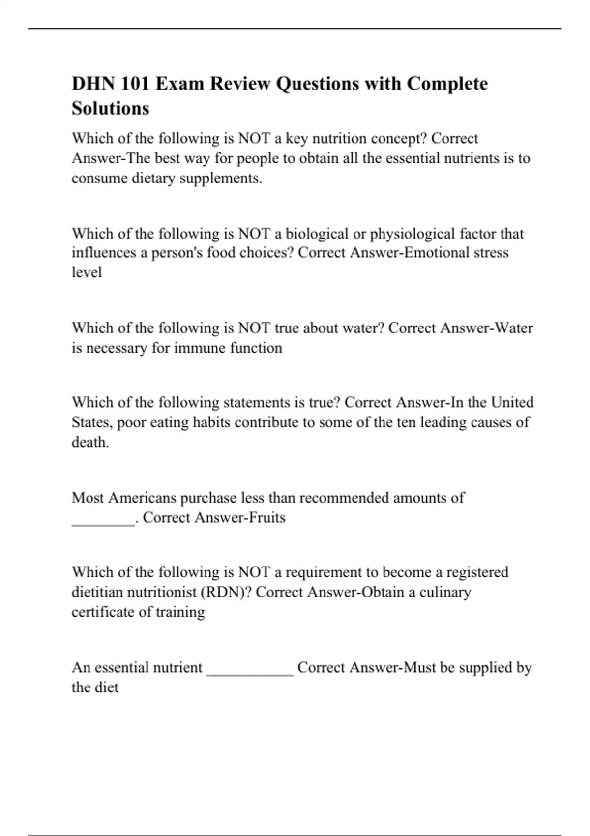 Which of the following is NOT a key nutrition concept? Correct Answer-The best way for people to obtain all the essential nutrients is to consume dietary supplements. Which of the following is NOT a biological or physiological factor that influences a person's food choices? Correct Answer-Emotional stress level Which of the following is NOT true about water? Correct Answer-Water is necessary for immune function Which of the following statements is true? Correct Answer-In the United States, poor eating habits contribute to some of the ten leading causes of death. Most Americans purchase less than recommended amounts of ________. Correct Answer-Fruits Which of the following is NOT a requirement to become a registered dietitian nutritionist (RDN)? Correct Answer-Obtain a culinary certificate of training
