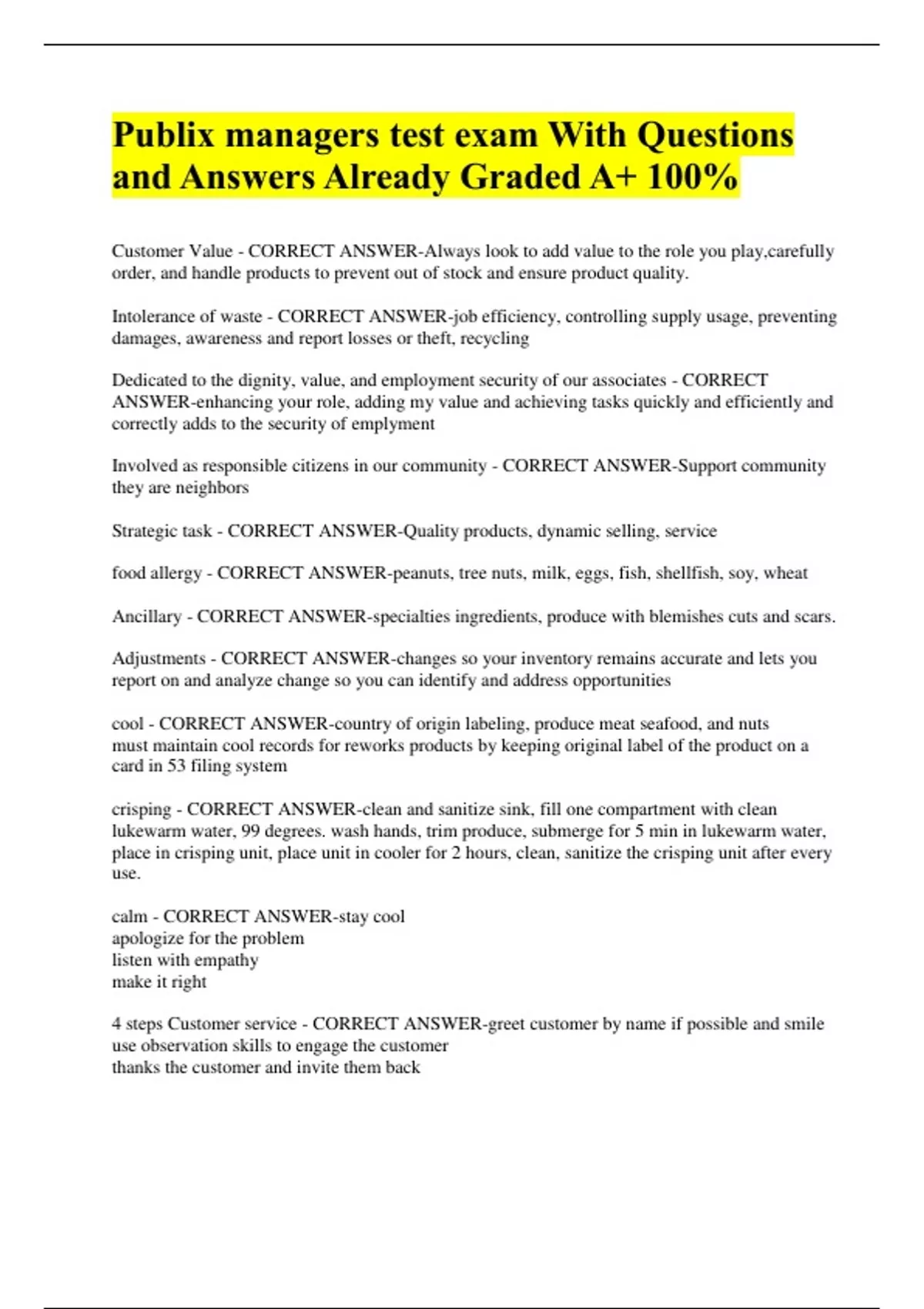 Publix managers test exam With Questions and Answers Already Graded A+ 100% Customer Value - CORRECT ANSWER-Always look to add value to the role you play,carefully order, and handle products to prevent out of stock and ensure product quality. Intolerance of waste - CORRECT ANSWER-job efficiency, controlling supply usage, preventing damages, awareness and report losses or theft, recycling Dedicated to the dignity, value, and employment security of our associates - CORRECT ANSWER-enhancing your role, adding my value and achieving tasks quickly and efficiently and correctly adds to the security of emplyment Involved as responsible citizens in our community - CORRECT ANSWER-Support community they are neighbors Strategic task - CORRECT ANSWER-Quality products, dynamic selling, service food allergy - CORRECT ANSWER-peanuts, tree nuts, milk, eggs, fish, shellfish, soy, wheat Ancillary - CORRECT ANSWER-specialties ingredients, produce with blemishes cuts and scars. Adjustments - CORRECT ANSWER-changes so your inventory remains accurate and lets you report on and analyze change so you can identify and address opportunities