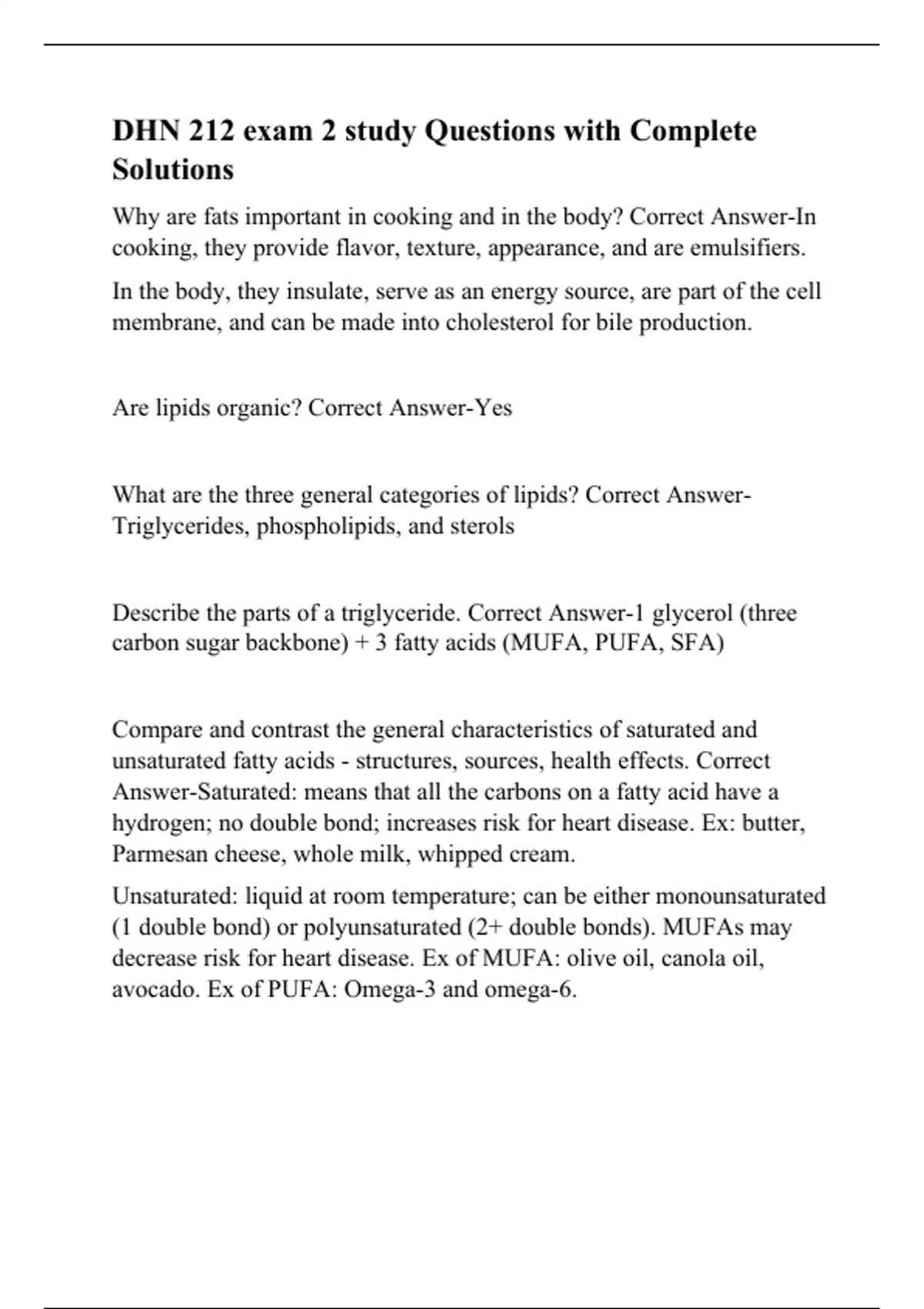 Why are fats important in cooking and in the body? Correct Answer-In cooking, they provide flavor, texture, appearance, and are emulsifiers. In the body, they insulate, serve as an energy source, are part of the cell membrane, and can be made into cholesterol for bile production. Are lipids organic? Correct Answer-Yes What are the three general categories of lipids? Correct Answer-Triglycerides, phospholipids, and sterols Describe the parts of a triglyceride. Correct Answer-1 glycerol (three carbon sugar backbone) + 3 fatty acids (MUFA, PUFA, SFA) Compare and contrast the general characteristics of saturated and unsaturated fatty acids - structures, sources, health effects. Correct Answer-Saturated: means that all the carbons on a fatty acid have a hydrogen; no double bond; increases risk for heart disease. Ex: butter, Parmesan cheese, whole milk, whipped cream. Unsaturated: liquid at room temperature; can be either monounsaturated (1 double bond) or polyunsaturated (2+ double bonds). MUFAs may decrease risk for heart disease. Ex of MUFA: olive oil, canola oil, avocado. Ex of PUFA: Omega-3 and omega-6.