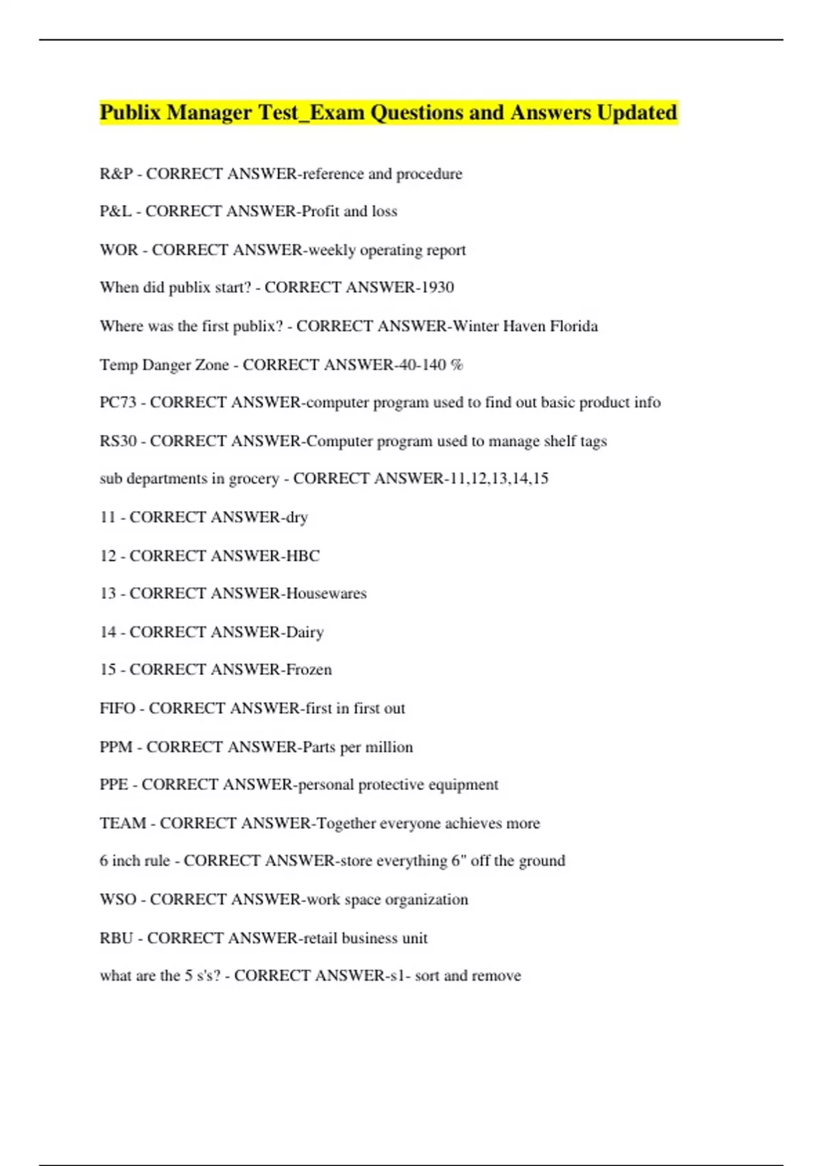 Publix Manager Test_Exam Questions and Answers Updated R&P - CORRECT ANSWER-reference and procedure P&L - CORRECT ANSWER-Profit and loss WOR - CORRECT ANSWER-weekly operating report When did publix start? - CORRECT ANSWER-1930 Where was the first publix? - CORRECT ANSWER-Winter Haven Florida Temp Danger Zone - CORRECT ANSWER-40-140 % PC73 - CORRECT ANSWER-computer program used to find out basic product info RS30 - CORRECT ANSWER-Computer program used to manage shelf tags sub departments in grocery - CORRECT ANSWER-11,12,13,14,15 11 - CORRECT ANSWER-dry 12 - CORRECT ANSWER-HBC 13 - CORRECT ANSWER-Housewares 14 - CORRECT ANSWER-Dairy 15 - CORRECT ANSWER-Frozen FIFO - CORRECT ANSWER-first in first out PPM - CORRECT ANSWER-Parts per million PPE - CORRECT ANSWER-personal protective equipment TEAM - CORRECT ANSWER-Together everyone achieves more 6 inch rule - CORRECT ANSWER-store everything 6" off the ground WSO - CORRECT ANSWER-work space organization RBU - CORRECT ANSWER-retail business unit what are the 5 s's? - CORRECT ANSWER-s1- sort and remove