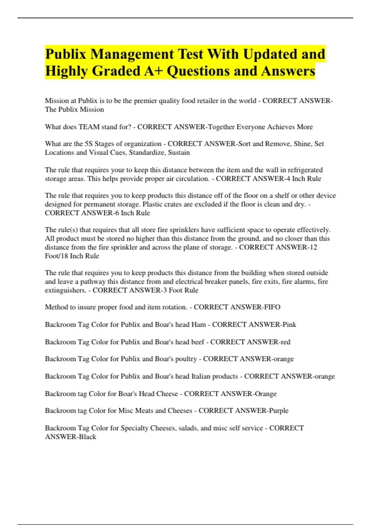 Publix Management Test With Updated and Highly Graded A+ Questions and Answers Mission at Publix is to be the premier quality food retailer in the world - CORRECT ANSWER-The Publix Mission What does TEAM stand for? - CORRECT ANSWER-Together Everyone Achieves More What are the 5S Stages of organization - CORRECT ANSWER-Sort and Remove, Shine, Set Locations and Visual Cues, Standardize, Sustain The rule that requires your to keep this distance between the item and the wall in refrigerated storage areas. This helps provide proper air circulation. - CORRECT ANSWER-4 Inch Rule The rule that requires you to keep products this distance off of the floor on a shelf or other device designed for permanent storage. Plastic crates are excluded if the floor is clean and dry. - CORRECT ANSWER-6 Inch Rule The rule(s) that requires that all store fire sprinklers have sufficient space to operate effectively. All product must be stored no higher than this distance from the ground, and no closer than this distance from the fire sprinkler and across the plane of storage. - CORRECT ANSWER-12 Foot/18 Inch Rule The rule that requires you to keep products this distance from the building when stored outside and leave a pathway this distance from and electrical breaker panels, fire exits, fire alarms, fire extinguishers. - CORRECT ANSWER-3 Foot Rule Method to insure proper food and item rotation. - CORRECT ANSWER-FIFO Backroom Tag Color for Publix and Boar's head Ham - CORRECT ANSWER-Pink Backroom Tag Color for Publix and Boar's head beef - CORRECT ANSWER-red Backroom Tag Color for Publix and Boar's poultry - CORRECT ANSWER-orange Backroom Tag Color for Publix and Boar's head Italian products - CORRECT ANSWER-orange Backroom tag Color for Boar's Head Cheese - CORRECT ANSWER-Orange Backroom tag Color for Misc Meats and Cheeses - CORRECT ANSWER-Purple Backroom Tag Color for Specialty Cheeses, salads, and misc self service - CORRECT ANSWER-Black