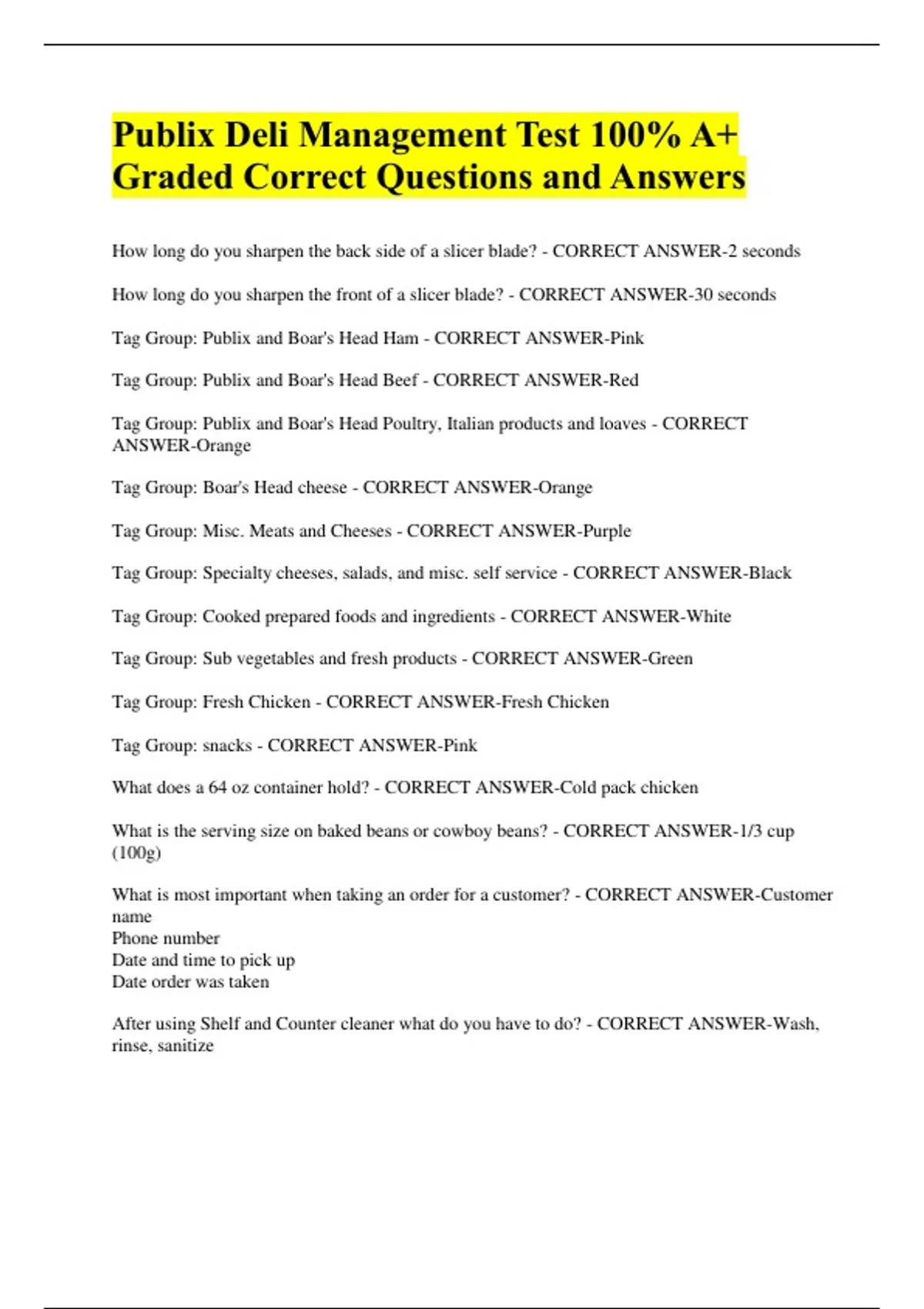 Publix Deli Management Test 100% A+ Graded Correct Questions and Answers How long do you sharpen the back side of a slicer blade? - CORRECT ANSWER-2 seconds How long do you sharpen the front of a slicer blade? - CORRECT ANSWER-30 seconds Tag Group: Publix and Boar's Head Ham - CORRECT ANSWER-Pink Tag Group: Publix and Boar's Head Beef - CORRECT ANSWER-Red Tag Group: Publix and Boar's Head Poultry, Italian products and loaves - CORRECT ANSWER-Orange Tag Group: Boar's Head cheese - CORRECT ANSWER-Orange Tag Group: Misc. Meats and Cheeses - CORRECT ANSWER-Purple Tag Group: Specialty cheeses, salads, and misc. self service - CORRECT ANSWER-Black Tag Group: Cooked prepared foods and ingredients - CORRECT ANSWER-White Tag Group: Sub vegetables and fresh products - CORRECT ANSWER-Green Tag Group: Fresh Chicken - CORRECT ANSWER-Fresh Chicken Tag Group: snacks - CORRECT ANSWER-Pink What does a 64 oz container hold? - CORRECT ANSWER-Cold pack chicken What is the serving size on baked beans or cowboy beans? - CORRECT ANSWER-1/3 cup (100g) What is most important when taking an order for a customer? - CORRECT ANSWER-Customer name Phone number Date and time to pick up Date order was taken After using Shelf and Counter cleaner what do you have to do? - CORRECT ANSWER-Wash, rinse, sanitize