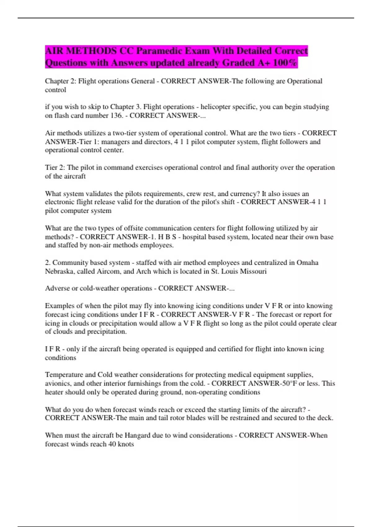 AIR METHODS CC Paramedic Exam With Detailed Correct Questions with Answers updated already Graded A+ 100% Chapter 2: Flight operations General - CORRECT ANSWER-The following are Operational control if you wish to skip to Chapter 3. Flight operations - helicopter specific, you can begin studying on flash card number 136. - CORRECT ANSWER-... Air methods utilizes a two-tier system of operational control. What are the two tiers - CORRECT ANSWER-Tier 1: managers and directors, 4 1 1 pilot computer system, flight followers and operational control center. Tier 2: The pilot in command exercises operational control and final authority over the operation of the aircraft What system validates the pilots requirements, crew rest, and currency? It also issues an electronic flight release valid for the duration of the pilot's shift - CORRECT ANSWER-4 1 1 pilot computer system What are the two types of offsite communication centers for flight following utilized by air methods? - CORRECT ANSWER-1. H B S - hospital based system, located near their own base and staffed by non-air methods employees. 2. Community based system - staffed with air method employees and centralized in Omaha Nebraska, called Aircom, and Arch which is located in St. Louis Missouri Examples of when the pilot may fly into knowing icing conditions under V F R or into knowing forecast icing conditions under I F R - CORRECT ANSWER-V F R - The forecast or report for icing in clouds or precipitation would allow a V F R flight so long as the pilot could operate clear of clouds and precipitation. I F R - only if the aircraft being operated is equipped and certified for flight into known icing conditions Temperature and Cold weather considerations for protecting medical equipment supplies, avionics, and other interior furnishings from the cold. - CORRECT ANSWER-50°F or less. This heater should only be operated during ground, non-operating conditions What do you do when forecast winds reach or exceed the starting limits of the aircraft? - CORRECT ANSWER-The main and tail rotor blades will be restrained and secured to the deck. When must the aircraft be Hangard due to wind considerations - CORRECT ANSWER-When forecast winds reach 40 knots What are your precipitation considerations when dealing with adverse weather? - CORRECT ANSWER-When forecast contains freezing rain, hail, or heavy snow, the aircraft will be safely relocated prior to the occurrence of forecast conditions What are the proximity and movement considerations in regards to adverse weather - CORRECT ANSWER-When a weather systems movement or proximity of the hazardous weather requires an exercise of caution to protect the aircraft from potential damage, the P I C shall safely relocate the aircraft to a safe location as outlined in the local procedures. What is the procedure for requesting additional training? - CORRECT ANSWER-Request shall be coordinated through the appropriate chain of command with final approval from the chief pilot As P I C you have not flown in the specific make, model or series aircraft in the last 60 days what must you accomplish? - CORRECT ANSWER-As a minimum you must accomplish one start and three takeoffs and landings As P I C you have not flown on your specific make, model, or series aircraft in the last 90 days. What must you do? - CORRECT ANSWER-You must notify the Regional Aviation Manager to determine if any training is needed for the pilot to perform competently and safely in that aircraft. If you have not fallen over a route and into an airport/heliport within the preceding 90 days what must you do? - CORRECT ANSWER-Study the appropriate I F R enroute or V F R aeronautical charts, destination airport/heliport diagrams, appropriate I F R approach charts for destination and alternate, if applicable What are the three requirements for night operations in regards to airport requirements? - CORRECT ANSWER-1. Determine the wind direction prior to take off and landing. 2. Boundary or runway lights clearly show limits of landing and takeoff area. 3. Night is defined as the period from end of evening civil twilight to the beginning of morning civil twilight. Before start/before take off confirmation check - CORRECT ANSWER-... Prior to start and lift off what must each pilot do in regards to the confirmation checks - CORRECT ANSWER-Each pilot will verbally challenged him or herself and respond verbally to each item on the confirmation checklist to ensure that each item is complete Who are the only authorized individuals to carry weapons on Air Methods aircraft? What weapons are included and prohibited? - CORRECT ANSWER-Local, state, or federal employees I.e. Law-enforcement officers are authorized to carry weapons. including fire arms and tasers. Pepper spray, mace or other aerosol products are prohibited PIC shall not allow cell phones or portable electronic devices to be used during what modes of flight - CORRECT ANSWER-taxi, takeoff, enroute, approach or landing When can electronic devices be used in CRUISE flight? - CORRECT ANSWER-When an E M I, R F I flight test profile, developed by Air Methods has been conducted What is the zero tolerance policy in the interest of safety in regards to cell phone & electronic devices? - CORRECT ANSWER-No verbal communications, sending or receiving texts, email or instant message while in flight and aboard an aircraft What does a RED cyclic warning cover mean and when should it be installed - CORRECT ANSWER-It means the aircraft is out of service and should be installed prior to rendering out of service Who can install and/or remove a RED cyclic warning cover? - CORRECT ANSWER-Any Pilot or Mechanic can install a RED cover. Only a mechanic or an authorized pilot can remove it after the aircraft has been returned to service. When do pilots utilize a YELLOW cyclic warning cover - CORRECT ANSWER-Anytime the aircraft is restrained from flight. I E, tie downs in place, ground power connected, required documentation removed f