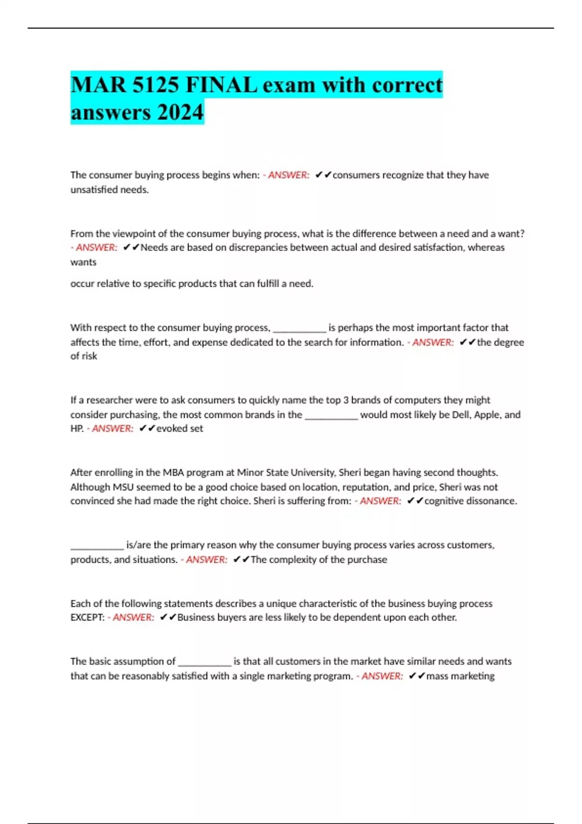 The consumer buying process begins when: - ANSWER: consumers recognize that they have unsatisfied needs. From the viewpoint of the consumer buying process, what is the difference between a need and a want? - ANSWER: Needs are based on discrepancies between actual and desired satisfaction, whereas wants occur relative to specific products that can fulfill a need. With respect to the consumer buying process, __________ is perhaps the most important factor that affects the time, effort, and expense dedicated to the search for information. - ANSWER: the degree of risk If a researcher were to ask consumers to quickly name the top 3 brands of computers they might consider purchasing, the most common brands in the __________ would most likely be Dell, Apple, and HP. - ANSWER: evoked set After enrolling in the MBA program at Minor State University, Sheri began having second thoughts. Although MSU seemed to be a good choice based on location, reputation, and price, Sheri was not convinced she had made the right choice. Sheri is suffering from: - ANSWER: cognitive dissonance. __________ is/are the primary reason why the consumer buying process varies across customers, products, and situations. - ANSWER: The complexity of the purchase Each of the following statements describes a unique characteristic of the business buying process EXCEPT: - ANSWER: Business buyers are less likely to be dependent upon each other. The basic assumption of __________ is that all customers in the market have similar needs and wants that can be reasonably satisfied with a single marketing program. - ANSWER: mass marketing The main advantage of __________ is specialization, as it allows the firm to focus its resources toward understanding and serving a single