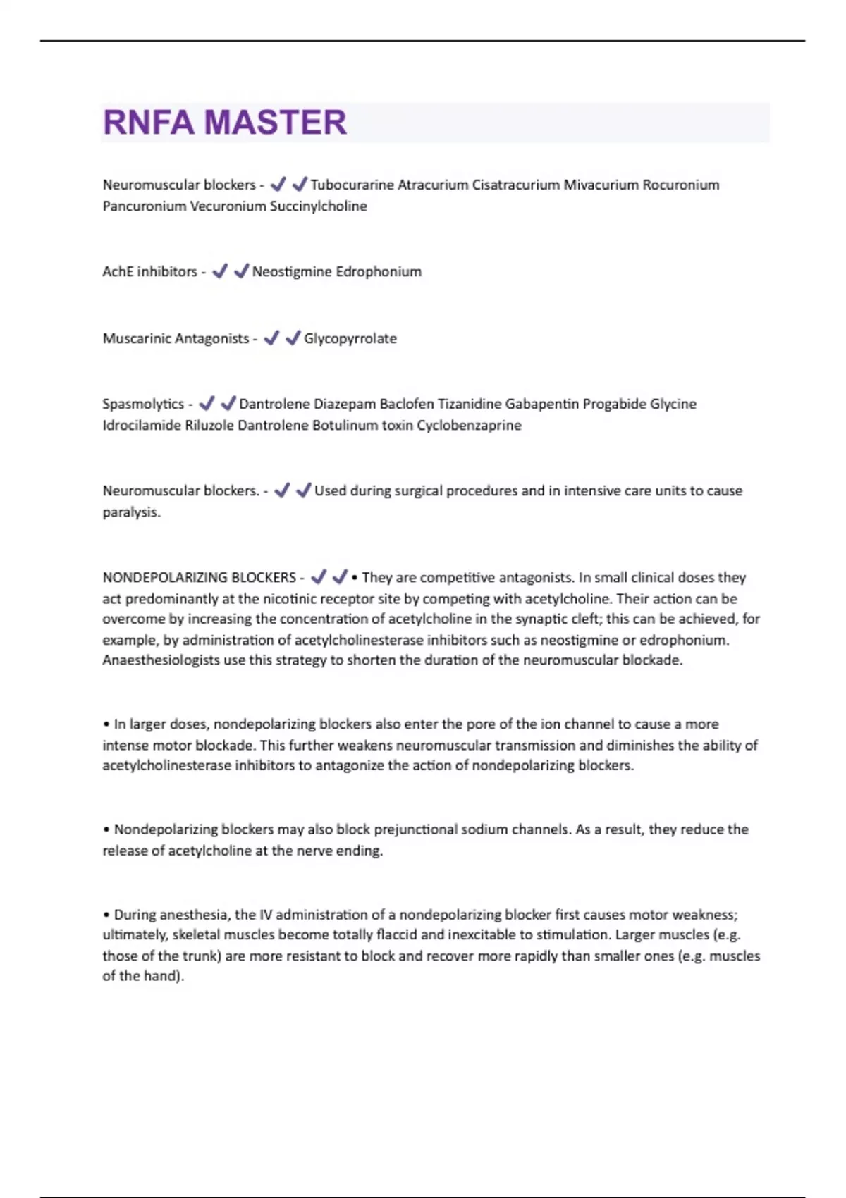 Neuromuscular blockers - Tubocurarine Atracurium Cisatracurium Mivacurium Rocuronium Pancuronium Vecuronium Succinylcholine AchE inhibitors - Neostigmine Edrophonium Muscarinic Antagonists - Glycopyrrolate Spasmolytics - Dantrolene Diazepam Baclofen Tizanidine Gabapentin Progabide Glycine Idrocilamide Riluzole Dantrolene Botulinum toxin Cyclobenzaprine Neuromuscular blockers. - Used during surgical procedures and in intensive care units to cause paralysis. NONDEPOLARIZING BLOCKERS - • They are competitive antagonists. In small clinical doses they act predominantly at the nicotinic receptor site by competing with acetylcholine. Their action can be overcome by increasing the concentration of acetylcholine in the synaptic cleft; this can be achieved, for example, by administration of acetylcholinesterase inhibitors such as neostigmine or edrophonium. Anaesthesiologists use this strategy to shorten the duration of the neuromuscular blockade. • In larger doses, nondepolarizing blockers also enter the pore of the ion channel to cause a more intense motor blockade. This further weakens neuromuscular transmission and diminishes the ability of acetylcholinesterase inhibitors to antagonize the action of nondepolarizing blockers. • Nondepolarizing blockers may also block prejunctional sodium channels. As a result, they reduce the release of acetylcholine at the nerve ending. • During anesthesia, the IV administration of a nondepolarizing blocker first causes motor weakness; ultimately, skeletal muscles become totally flaccid and inexcitable to stimulation. Larger muscles (e.g. those of the trunk) are more resistant to block and recover more rapidly than smaller ones (e.g. muscles of the hand).DEPOLARIZING BLOCKERS - Succinylcholine is the only depolarizing neuromuscular blocker used clinically in the USA. succinylcholine remains popular because it is the only ultrarapid onset/ultrashort duration neuromuscular blocker available. • Succinylcholine binds to the nicotinic receptor and acts like acetylcholine to cause depolarization of the end plate. This in turn spreads and depolarizes adjacent membranes, causing transient fasciculations, especially in chest and abdomen, though general anesthesia and prior administration of a small dose of a nondepolarizing muscle relaxant tends to attenuate them. Succinylcholine is not metabolized effectively at the synapse, therefore the membrane remains depolarized and unresponsive to additional impulses. A flaccid paralysis results. This is called Phase I block, or depolarization block. Phase I block is augmented, not reversed, by acetylcholinesterase inhibitors. • The onset of neuromuscular blockade is very rapid, usually within 1 minute. Because of its rapid hydrolysis by plasma butyrylcholinesterase (pseudocholinesterase), duration of neuromuscular block is 5-10 minutes. • With a single large dose, repeated doses, or prolonged continued infusion of succinylcholine (30-60 minutes) the membrane repolarizes; despite this repolarization, the membrane can't be depolarized again because it is desensitized. The channels behave as if they are in a prolonged closed state. This is called phase II block or desensitization block. Phase II block may be reversed by acetylcholinesterase inhibitors. PHARMACOKINETICS OF NEUROMUSCULAR BLOCKERS - • All neuromuscular blocking agents contain one or two quaternary ammonium groups, which makes them highly polar and very poorly soluble in lipid. • Neuromuscular blockers are inactive if given by mouth. They are always given IV or IM. They penetrate membranes very poorly and do not enter cells or cross the blood-brain barrier. NON-DEPOLARIZING BLOCKERS - Highly ionized. They don't cross membranes well and have limited volume of distribution of 80-140 mL/Kg -not much larger than blood volume. They have durations of action that range from 20 to 90 minutes, which can be extended by supplemental dosing. Non-depolarizing blockers can be classified into: long-, intermediate-, and short-acting. SHORT-ACTINGMivacurium INTERMEDIATE-ACTING Atracurium Rocuronium Cisatracurium Vecuronium LONG-ACTING Tubocurarine Pancuronium METABOLISM - The duration of neuromuscular blockade produced by nondepolarizing relaxants is strongly correlated with the elimination half-life. Drugs that are excreted by the kidney typically have longer half-lives, leading to longer durations of action. Drugs eliminated by the liver tend to have shorter half-lives and durations of action. Atracurium is inactivated by hydrolysis by non-specific plasma esterases and by a spontaneous reaction (Hoffman elimination). Duration of neuromuscular block produced by atracurium is not altered by the absence of renal function. One of atracurium metabolites is laudanosine. Laudanosine may cause transient hypotension and, in higher doses, seizures. Cisatracurium, a stereoisomer of atracurium, undergoes Hoffman elimination to form laudanosine. Because cisatracurium is more potent than atracurium and lower doses are required, laudanosine concentrations following cisatracurium administration are lower. Cisatracurium also causes less histamine release. Therefore, cisatracurium has largely replaced atracurium in clinical practice.Mivacurium has short duration of action. Hydrolysis by butyrylcholinesterase is the primary mechanism for inactivation of mivacurium. Not dependent on liver or kidney. Rocuronium has the most rapid onset among nondepolarizing blockers. Can be used as alternative to succinylcholine for rapid sequence intubation. DEPOLARIZING BLOCKERS - The extremely short duration of action of succinylcholine (5-10 minutes) is due to its rapid hydrolysis by plasma (and hepatic) butyrylcholinesterase. Neuromuscular blockade by succinylcholine (and mivacurium) may be prolonged in patients with an abnormal variant of butyrylcholinesterase. Prolonged paralysis from succinylcholine caused by abnormal butyrylcholinesterase should be treated with continued mechanical ventilation