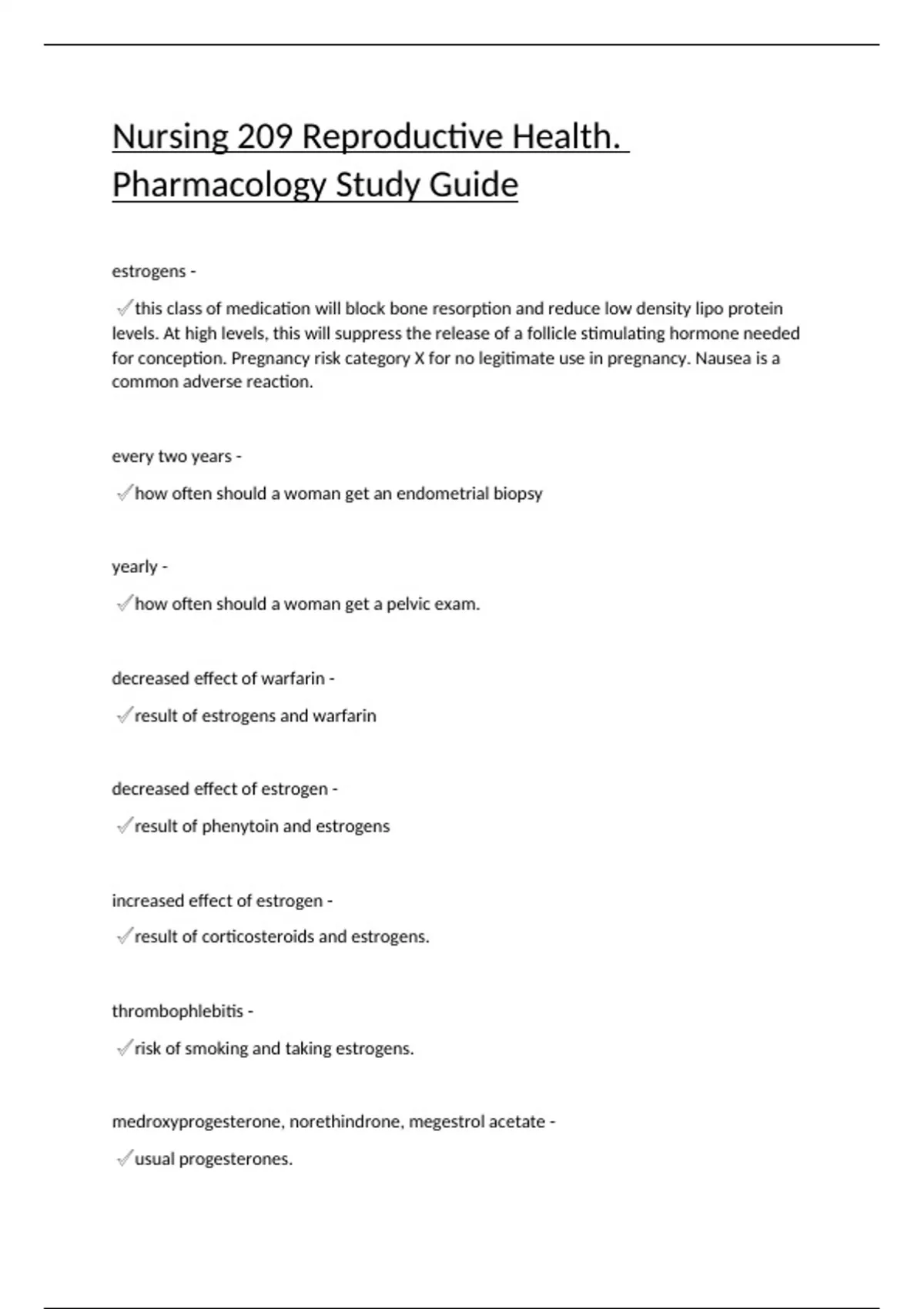 Nursing 209 Reproductive Health. Pharmacology Study Guide