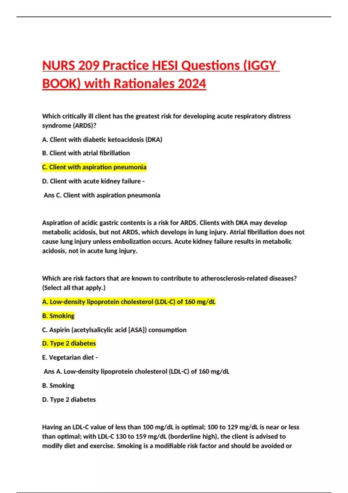 NURS 209 Practice HESI Questions (IGGY BOOK) with Rationales 2024.