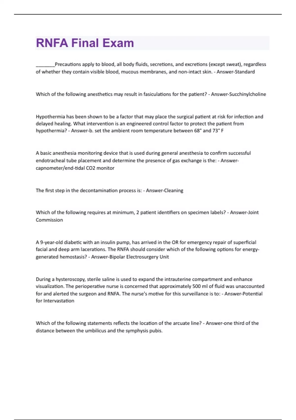 _______Precautions apply to blood, all body fluids, secretions, and excretions (except sweat), regardless of whether they contain visible blood, mucous membranes, and non-intact skin. - Answer-Standard Which of the following anesthetics may result in fasiculations for the patient? - Answer-Succhinylcholine Hypothermia has been shown to be a factor that may place the surgical patient at risk for infection and delayed healing. What intervention is an engineered control factor to protect the patient from hypothermia? - Answer-b. set the ambient room temperature between 68° and 73° F A basic anesthesia monitoring device that is used during general anesthesia to confirm successful endotracheal tube placement and determine the presence of gas exchange is the: - Answercapnometer/end-tidal CO2 monitor The first step in the decontamination process is: - Answer-Cleaning Which of the following requires at minimum, 2 patient identifiers on specimen labels? - Answer-Joint Commission A 9-year-old diabetic with an insulin pump, has arrived in the OR for emergency repair of superficial facial and deep arm lacerations. The RNFA should consider which of the following options for energygenerated hemostasis? - Answer-Bipolar Electrosurgery Unit During a hysteroscopy, sterile saline is used to expand the intrauterine compartment and enhance visualization. The perioperative nurse is concerned that approximately 500 ml of fluid was unaccounted for and alerted the surgeon and RNFA. The nurse's motive for this surveillance is to: - Answer-Potential for Intervastation Which of the following statements reflects the location of the arcuate line? - Answer-one third of the distance between the umbilicus and the symphysis pubis.Laparoscopic procedures that emergently convert to open procedures place the patient at risk for unintentional retained surgical items (RSI). What risk reduction strategy could prevent RSI? - AnswerReplacing or tagging sponges and laparotomy instruments with RFID chips. The surgical hand scrub is designed to render the hands, nails, and arms - Answer-Surgically Clean The RNFA instructed the new anesthesia resident in the proper positioning of the arm and hands on the OR bed armboards. The resident was cautioned to avoid pressure on the elbow to prevent: - AnswerUlnar Nerve Injury A type of suture to help eliminate tension on the primary suture line is known as: - Answer-Retention Suture Identify the primary substance found in the epidermis that protects the body from fluid loss and invasion by pathogens. - Answer-Keratin When a patient absorbs an unsafe amount of local anesthetic into the bloodstream, a catastrophic outcome is possible. Treatment for LAST includes the use of which of the following? - Answer-Lipids When buried in tissue, silk loses its tensile strength after what period of time? - Answer-1 Year Guidelines from WHO focus on which of the following in the prevention of surgical site infections? - Answer-Use of Prophylactic Antibiotics To help visualize abdominal structures and to enhance safety during laparoscopic procedures, a pneumoperitoneum is created. After Veress needle confirmation, insufflation tubing is connected and the process begun. CO2 gas is used to insufflate the abdominal cavity at an ideal flow rate of ______ to achieve an ideal intra-abdominal pressure of ______. - Answer-9 L/min;14 to 16 mm Hg Due to the BMI of the patient, the case you are participating in was converted to open laparotomy. Your surgeon is uncertain as to which self retaining retractor is available within the facility. From the following, which is an appropriate suggestion? - Answer-Bookwalter