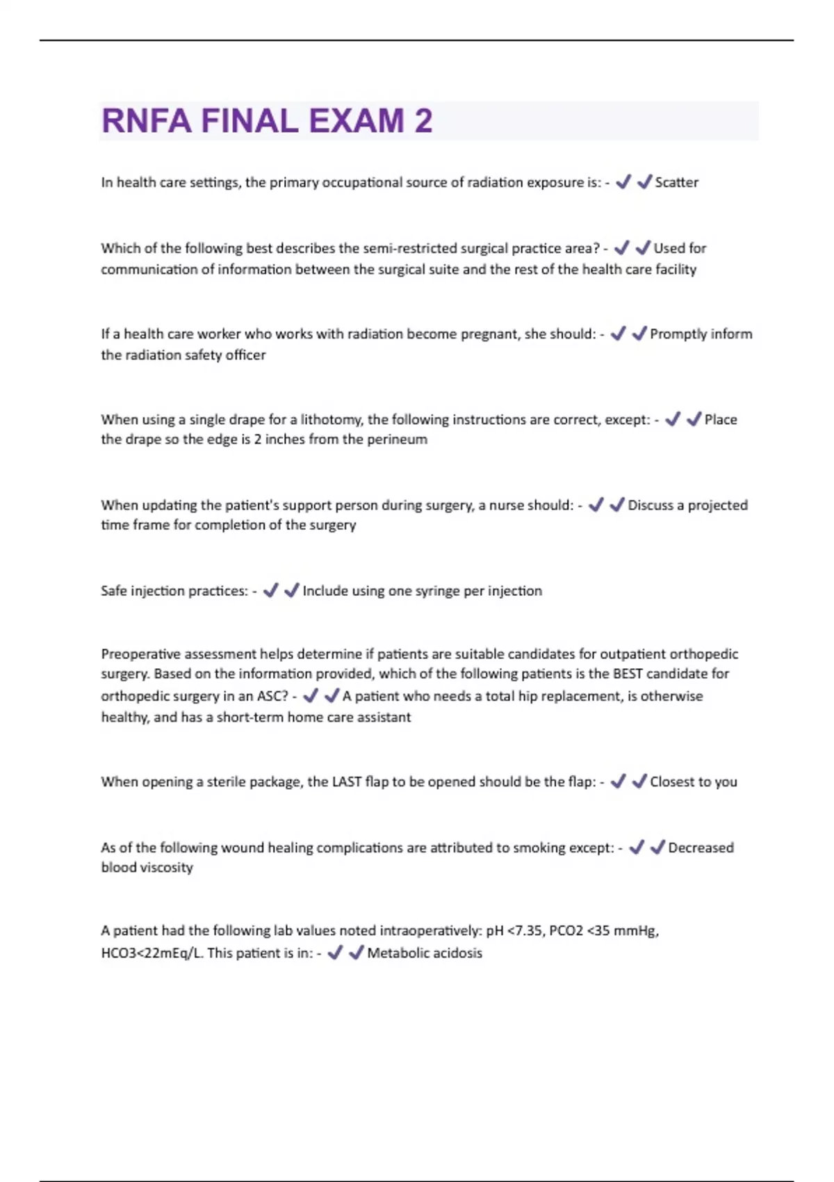 In health care settings, the primary occupational source of radiation exposure is: - Scatter Which of the following best describes the semi-restricted surgical practice area? - Used for communication of information between the surgical suite and the rest of the health care facility If a health care worker who works with radiation become pregnant, she should: - Promptly inform the radiation safety officer When using a single drape for a lithotomy, the following instructions are correct, except: - Place the drape so the edge is 2 inches from the perineum When updating the patient's support person during surgery, a nurse should: - Discuss a projected time frame for completion of the surgery Safe injection practices: - Include using one syringe per injection Preoperative assessment helps determine if patients are suitable candidates for outpatient orthopedic surgery. Based on the information provided, which of the following patients is the BEST candidate for orthopedic surgery in an ASC? - A patient who needs a total hip replacement, is otherwise healthy, and has a short-term home care assistant When opening a sterile package, the LAST flap to be opened should be the flap: - Closest to you As of the following wound healing complications are attributed to smoking except: - Decreased blood viscosity A patient had the following lab values noted intraoperatively: pH <7.35, PCO2 <35 mmHg, HCO3<22mEq/L. This patient is in: - Metabolic acidosisThis classification of medication can affect wound healing in the surgical patient: - Anticoagulants When choosing a suture needle for tissue such as peritoneum, dura, and subcutaneous tissue, the most appropriate choice is the _______ needle. - Taper During a THA using the posterior lateral approach, the RNFA will dislocated the head of the femur using: - Flexion, adduction, external rotation Which of the following muscles are critical for stabilization of the knee joint? - Quadriceps femoris During the cementing of components during total joint replacement, a new CRNA who has never worked in orthopedics before begins to panic. A side effect that possibly occurred with this patient as a result of the cement is: - Hypotension A medication often used in cardiac surgery to prevent spasms of vessels is: - Papaverine Physicians may consider which of the following options when determining the best treatment option for breast cancer surgery. - Size of tumor The most commonly used incision for Cesarean section is the: - Pfannensteil This technique is primarily reserved for the patient having prophylactic mastectomy and immediate breast reconstruction. - Nipple sparing The RNFA should be prepared to assist with the _______ procedure if a patient needs surgical intervention for the treatment of atrial fibrillation - Maze Prepping for an abdominal hysterectomy that may include the cervix should be performed in what order? - Dirty then cleanCare must be taken when placing reactors as an RNFA assisting with inguinal hernia repair. Which of the following is a vessel that is located in the area of i in inguinal hernias? - Inferior epigastric