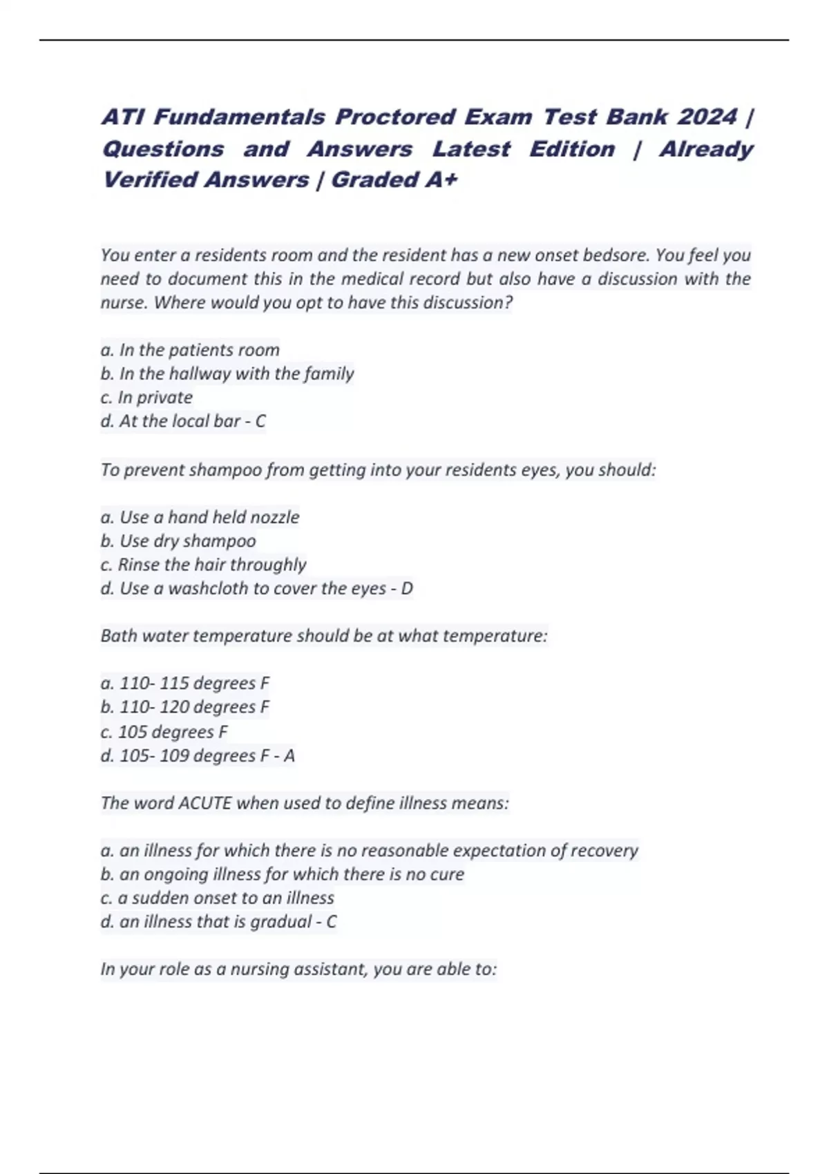 ATI Fundamentals Proctored Exam Test Bank 2024 | Questions and Answers Latest Edition | Already Verified Answers | Graded A+ You enter a residents room and the resident has a new onset bedsore. You feel you need to document this in the medical record but also have a discussion with the nurse. Where would you opt to have this discussion? a. In the patients room b. In the hallway with the family c. In private d. At the local bar - C To prevent shampoo from getting into your residents eyes, you should: a. Use a hand held nozzle b. Use dry shampoo c. Rinse the hair throughly d. Use a washcloth to cover the eyes - D Bath water temperature should be at what temperature: a. 110- 115 degrees F b. 110- 120 degrees F c. 105 degrees F d. 105- 109 degrees F - A The word ACUTE when used to define illness means: a. an illness for which there is no reasonable expectation of recovery b. an ongoing illness for which there is no cure c. a sudden onset to an illness d. an illness that is gradual - C In your role as a nursing assistant, you are able to: a. You can take verbal orders over the phone from doctors b. Give medications c. Insert a foley in the patients vagina or penis d. Report changes in the residents condition to the nurse - D An assisted living facility provides all of the following except: a. Housing b. Personal care c. Social activities d. 24 hour skilled nursing care - D Those persons who provide basic nursing care under the supervision of a registered nurse or a licensed practical nurse are: a. Licensed practical nurse b. Case managers c. Assistive personnel d. The "health care team" - C A federal insurance plan providing benefits for older persons and some younger persons with disabilities is called: a. Medicaid b. Medicare c. Blue Cross/ Blue Shield d. Coventry - B Which nursing care pattern focuses on tasks and jobs? a. Functional nursing b. Team nursing c. Primary nursing d. Care management - A You promote quality of life by: a. Delegating tasks to your coworkers b. Making sure you bring your resident chocolate and Starbucks c. Doing everything for the patient, they don't need to lift a finger d. Speaking to individuals in a respectful manner - D Your patient has left sided weakness, how do you put on their shirt? a. Clients choice b. Right sleeve c. Left sleeve d. Both sleeve together - C Exercises that move each muscle and joint care called? a. Rotation b. Adduction c. Range of Motion d. Abduction - C Your patient's roommate has just died, how can you BEST help the client with the loss? a. Discourage individual activity b. Encourage the client talk c. Convince the client its no big loss. The roommate was a complainer d. Leave the client alone - B You go to check on Mrs. Jones, she is very agitated. Your task is to give her a bed bath, When you walk in the room, she tells you "Get out of here. I do not want a bed bath". What should you do? a. Speak loudly because maybe Mrs. Jones didn't hear or understand you. b. Run c. Tell the client they have no choice, shut up and lets get cleaned up d. Talk calmly, slowly, reassure the client. Do not force them. Report the refusal to the nurse. - D Padding side rails on a bed serves a purpose. The purpose is: a. Restrain the patient b. Have somewhere to put the call button c. Keep the client warm d. Protect your client from possible injury - D Which of the following stages of dying is usually the final stage for the client? a. Anger b. Acceptance c. Bargaining d. Depression - B Which is more correct measure of urinary output? a. 30 oz b. 300ml or cc c. 2 cups d. 1 gallon - B The role of the ombudsman is: a. Work with the nursing home to protect the clients rights b. Control the nursing home budget c. Prepare classes that nurses aides take to learn hygiene d. Run a group of nursing homes - A The BEST time to prepare for a disaster is: a. During your lunch b. When everyone has gone to bed c. During a tornado or hurricane d. Before it happens - D Which temperature is considered MOST accurate? a. Oral b. Axillary (A) c. Temporal d. Rectal (R) - D The beginning sign of a pressure sore is: a. Coolness b. Discoloration c. Swelling d. Numbness - B What Act did Congress pass in 1987, to protect the quality of life, health and safety of nursing home residents? a. MedicareAct of 1987 b. Patients Bill of Rights c. EMTALA d. Omnibus Budget Reconciliation Act - D Your resident is wealthy. He offers you a "little gift" in the form of cash for providing expert care. You should: a. Accept and say nothing b. Accept like a tip and share it with your coworkers c. Refuse graciously d. Look to see if anyone is listening or watching - C Retirement usually results in: a. Physical changes from aging b. Financial security c. Less Free Time d. Typically a lower income - d After urinating, the resident is assisted to: a. Wash their hands b. Get back in bed c. GIven something to drink d. Put in a diaper - A What can happen is constipation is not relieved? a. Enema b. Diarrhea c. Incontinence d. Fecal Impaction - D When removing soiled linens, you must wear: a. A gown b. Face Mask c. Eye Protection d. Gloves - D Information that you can see, hear, feel or smell is called: a. Assessment b. Observation c. Objective data d. Subjective data - D A resident continues to ask you the same question over and over again each time you come into the room. You should: a. Tell the person you are tired of answering the same question b. Yell at the resident c. Report the behavior d. Be patient - D Before leaving on for lunch, you need to: