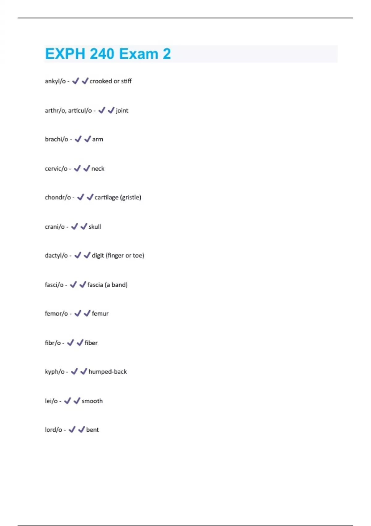 ankyl/o - crooked or stiff arthr/o, articul/o - joint brachi/o - arm cervic/o - neck chondr/o - cartilage (gristle) crani/o - skull dactyl/o - digit (finger or toe) fasci/o - fascia (a band) femor/o - femur fibr/o - fiber kyph/o - humped-back lei/o - smooth lord/o - bentlumb/o - loin (lower back) my/o, myos/o, muscul/o - muscle myel/o - bone marrow, spinal cord oste/o - bone patell/o - knee cap pelv/i - pelvic (basin), hip bone radi/o - radius rhabd/o - rod-shaped, striated (skeletal) sarc/o - flesh scoli.o - twisted spondyl/o, vertebr/o - vertebra stern/o - sternum (breastbone)
