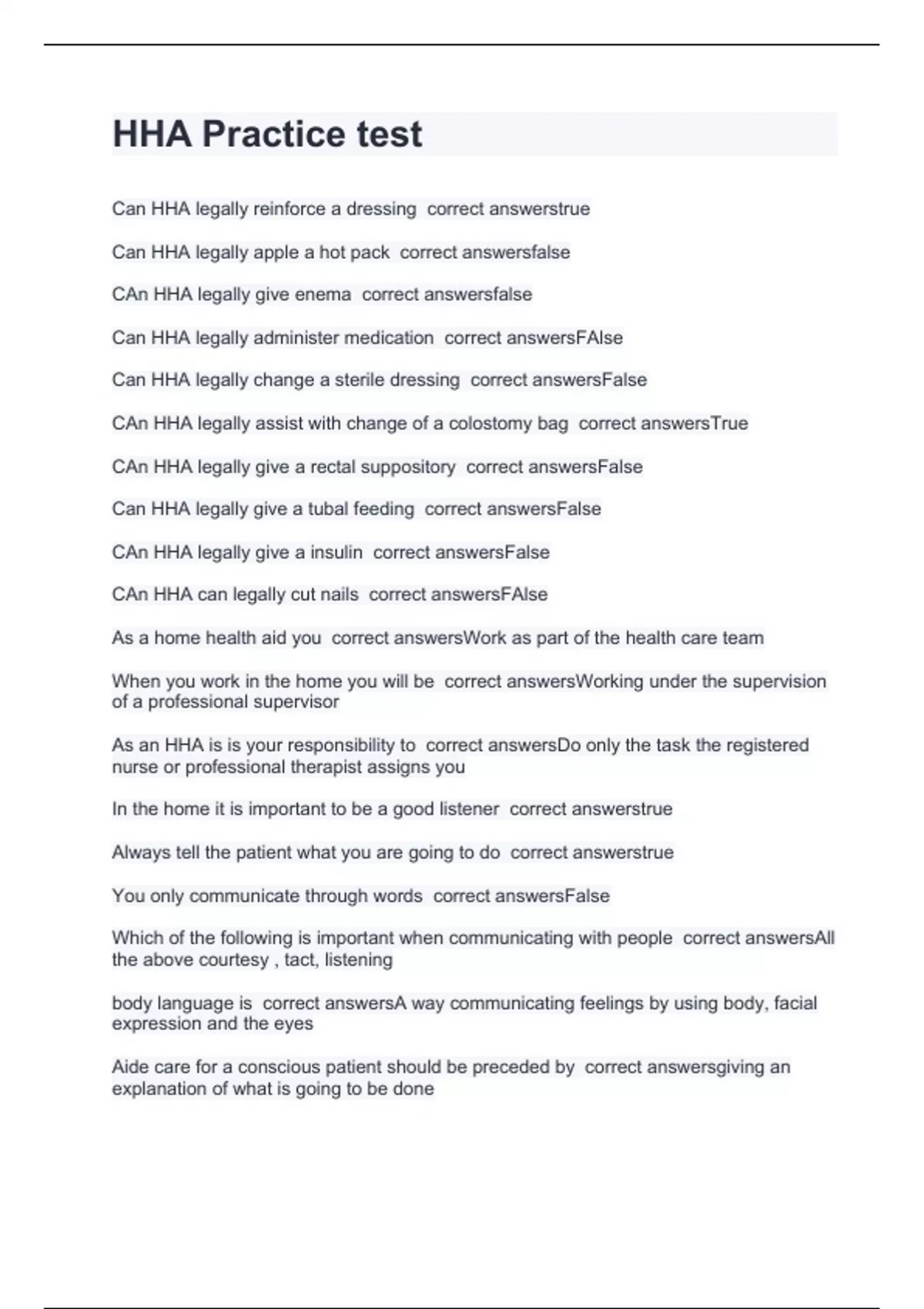 Can HHA legally reinforce a dressing correct answerstrue Can HHA legally apple a hot pack correct answersfalse CAn HHA legally give enema correct answersfalse Can HHA legally administer medication correct answersFAlse Can HHA legally change a sterile dressing correct answersFalse CAn HHA legally assist with change of a colostomy bag correct answersTrue CAn HHA legally give a rectal suppository correct answersFalse Can HHA legally give a tubal feeding correct answersFalse CAn HHA legally give a insulin correct answersFalse CAn HHA can legally cut nails correct answersFAlse As a home health aid you correct answersWork as part of the health care team When you work in the home you will be correct answersWorking under the supervision of a professional supervisor As an HHA is is your responsibility to correct answersDo only the task the registered nurse or professional therapist assigns you In the home it is important to be a good listener correct answerstrue Always tell the patient what you are going to do correct answerstrue You only communicate through words correct answersFalse Which of the following is important when communicating with people correct answersAll the above courtesy , tact, listening body language is correct answersA way communicating feelings by using body, facial expression and the eyes Aide care for a conscious patient should be preceded by correct answersgiving an explanation of what is going to be done