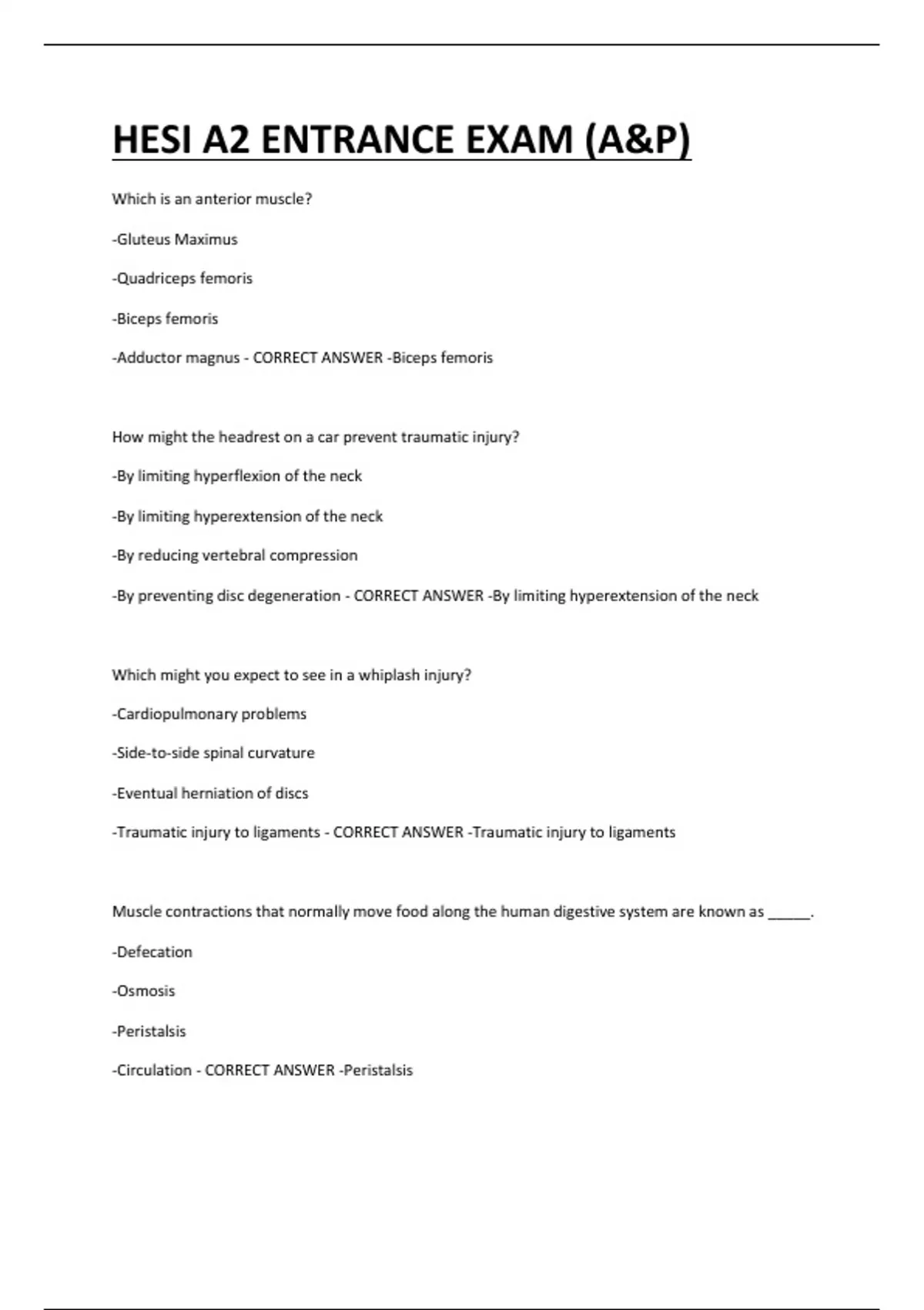 HESI A2 ENTRANCE EXAM (A&P) Which is an anterior muscle? -Gluteus Maximus -Quadriceps femoris -Biceps femoris -Adductor magnus - CORRECT ANSWER -Biceps femoris How might the headrest on a car prevent traumatic injury? -By limiting hyperflexion of the neck -By limiting hyperextension of the neck -By reducing vertebral compression -By preventing disc degeneration - CORRECT ANSWER -By limiting hyperextension of the neck Which might you expect to see in a whiplash injury? -Cardiopulmonary problems -Side-to-side spinal curvature -Eventual herniation of discs -Traumatic injury to ligaments - CORRECT ANSWER -Traumatic injury to ligaments Muscle contractions that normally move food along the human digestive system are known as _____. -Defecation -Osmosis -Peristalsis -Circulation - CORRECT ANSWER -Peristalsis