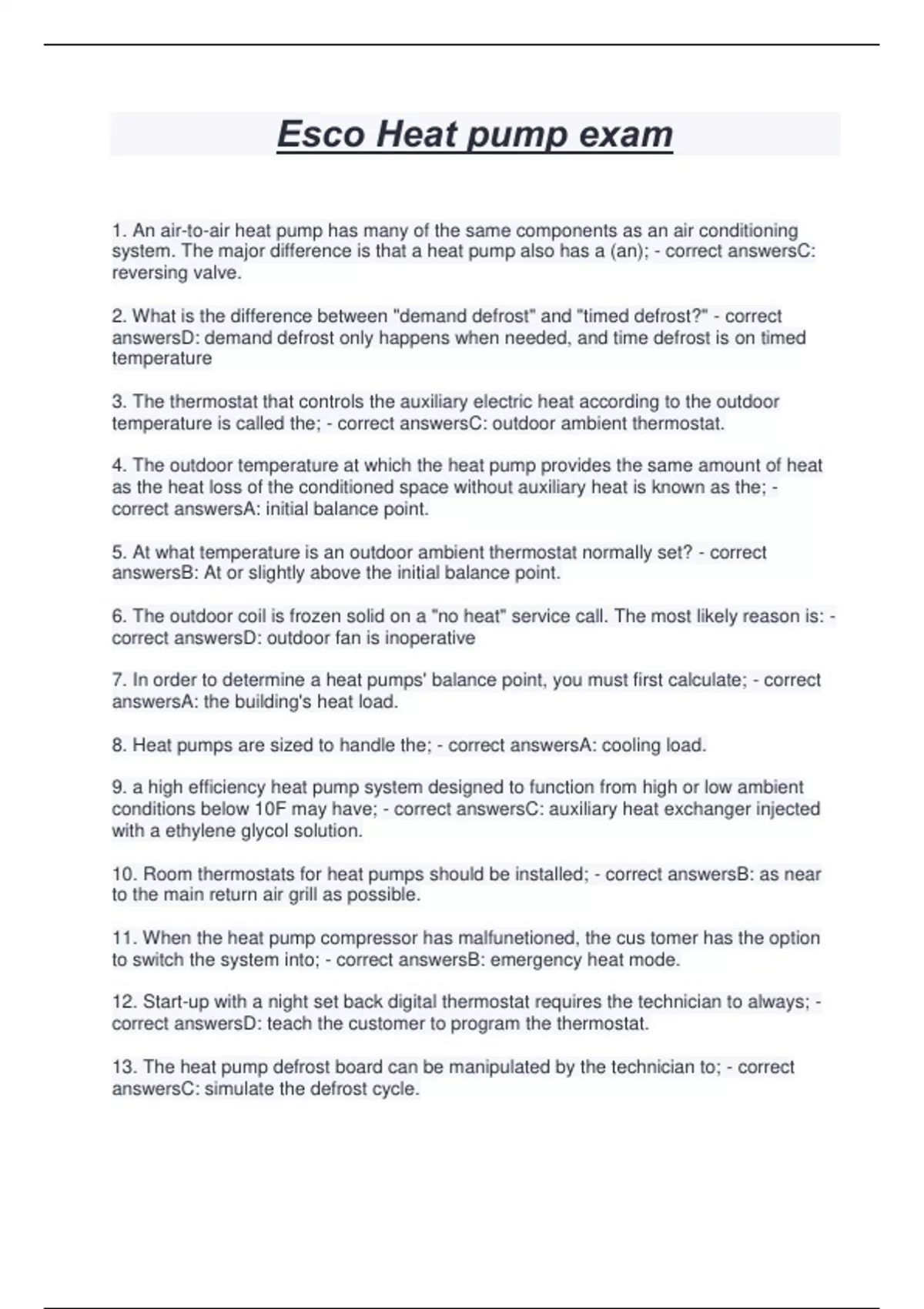 Esco Heat pump exam 1. An air-to-air heat pump has many of the same components as an air conditioning system. The major difference is that a heat pump also has a (an); - correct answersC: reversing valve. 2. What is the difference between "demand defrost" and "timed defrost?" - correct answersD: demand defrost only happens when needed, and time defrost is on timed temperature 3. The thermostat that controls the auxiliary electric heat according to the outdoor temperature is called the; - correct answersC: outdoor ambient thermostat. 4. The outdoor temperature at which the heat pump provides the same amount of heat as the heat loss of the conditioned space without auxiliary heat is known as the; - correct answersA: initial balance point. 5. At what temperature is an outdoor ambient thermostat normally set? - correct answersB: At or slightly above the initial balance point. 6. The outdoor coil is frozen solid on a "no heat" service call. The most likely reason is: - correct answersD: outdoor fan is inoperative 7. In order to determine a heat pumps' balance point, you must first calculate; - correct answersA: the building's heat load. 8. Heat pumps are sized to handle the; - correct answersA: cooling load. 9. a high efficiency heat pump system designed to function from high or low ambient conditions below 10F may have; - correct answersC: auxiliary heat exchanger injected with a ethylene glycol solution. 10. Room thermostats for heat pumps should be installed; - correct answersB: as near to the main return air grill as possible. 11. When the heat pump compressor has malfunetioned, the cus tomer has the option to switch the system into; - correct answersB: emergency heat mode. 12. Start-up with a night set back digital thermostat requires the technician to always; - correct answersD: teach the customer to program the thermostat. 13. The heat pump defrost board can be manipulated by the technician to; - correct answersC: simulate the defrost cycle