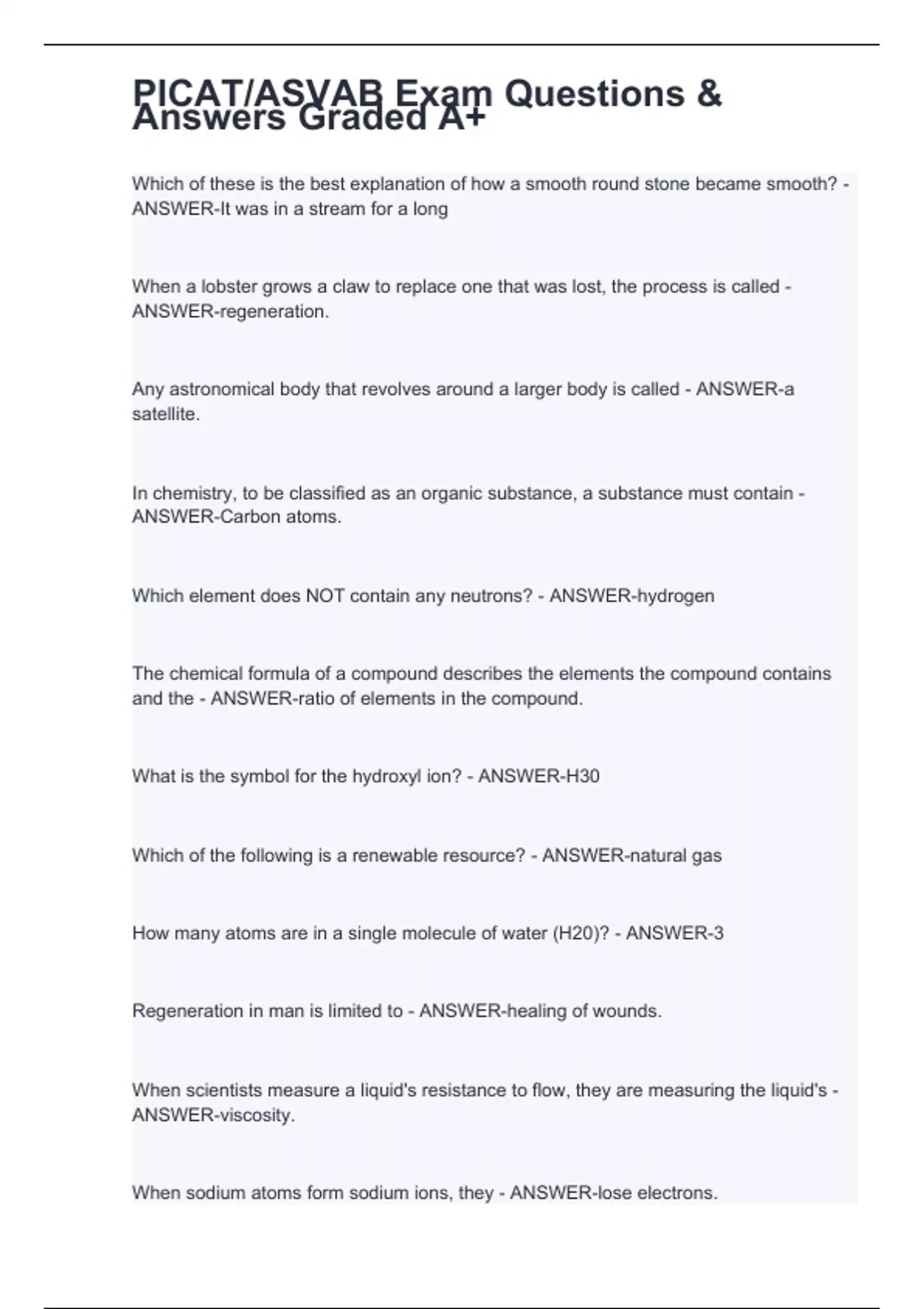 Which of these is the best explanation of how a smooth round stone became smooth? - ANSWER-It was in a stream for a long When a lobster grows a claw to replace one that was lost, the process is called - ANSWER-regeneration. Any astronomical body that revolves around a larger body is called - ANSWER-a satellite. In chemistry, to be classified as an organic substance, a substance must contain - ANSWER-Carbon atoms. Which element does NOT contain any neutrons? - ANSWER-hydrogen The chemical formula of a compound describes the elements the compound contains and the - ANSWER-ratio of elements in the compound. What is the symbol for the hydroxyl ion? - ANSWER-Н30 Which of the following is a renewable resource? - ANSWER-natural gas How many atoms are in a single molecule of water (H20)? - ANSWER-3 Regeneration in man is limited to - ANSWER-healing of wounds. When scientists measure a liquid's resistance to flow, they are measuring the liquid's - ANSWER-viscosity.
