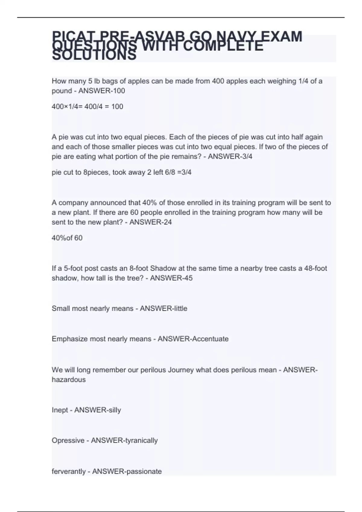 How many 5 lb bags of apples can be made from 400 apples each weighing 1/4 of a pound - ANSWER-100 400×1/4= 400/4 = 100 A pie was cut into two equal pieces. Each of the pieces of pie was cut into half again and each of those smaller pieces was cut into two equal pieces. If two of the pieces of pie are eating what portion of the pie remains? - ANSWER-3/4 pie cut to 8pieces, took away 2 left 6/8 =3/4 A company announced that 40% of those enrolled in its training program will be sent to a new plant. If there are 60 people enrolled in the training program how many will be sent to the new plant? - ANSWER-24 40%of 60 If a 5-foot post casts an 8-foot Shadow at the same time a nearby tree casts a 48-foot shadow, how tall is the tree? - ANSWER-45 Small most nearly means - ANSWER-little Emphasize most nearly means - ANSWER-Accentuate We will long remember our perilous Journey what does perilous mean - ANSWER-hazardous Inept - ANSWER-silly