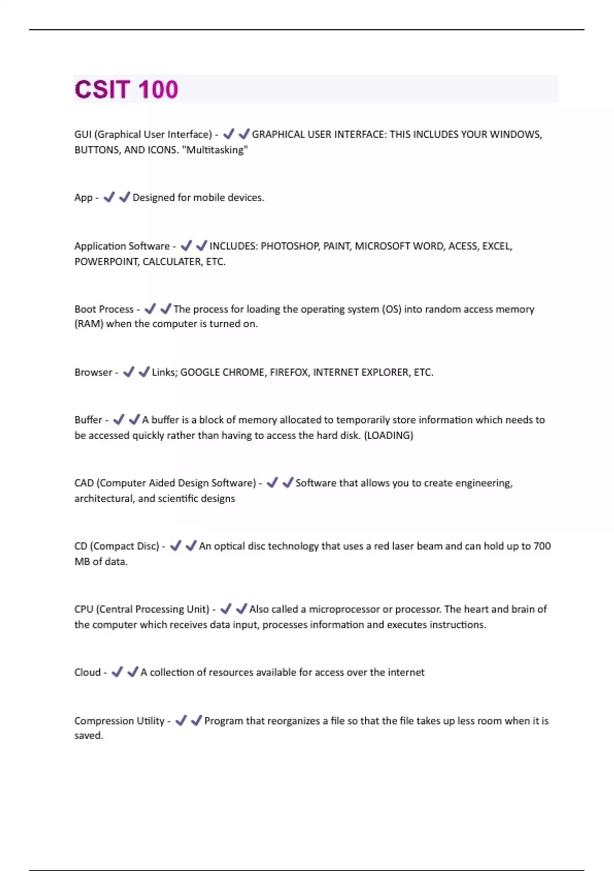 GUI (Graphical User Interface) - GRAPHICAL USER INTERFACE: THIS INCLUDES YOUR WINDOWS, BUTTONS, AND ICONS. "Multitasking" App - Designed for mobile devices. Application Software - INCLUDES: PHOTOSHOP, PAINT, MICROSOFT WORD, ACESS, EXCEL, POWERPOINT, CALCULATER, ETC. Boot Process - The process for loading the operating system (OS) into random access memory (RAM) when the computer is turned on. Browser - Links; GOOGLE CHROME, FIREFOX, INTERNET EXPLORER, ETC. Buffer - A buffer is a block of memory allocated to temporarily store information which needs to be accessed quickly rather than having to access the hard disk. (LOADING) CAD (Computer Aided Design Software) - Software that allows you to create engineering, architectural, and scientific designs CD (Compact Disc) - An optical disc technology that uses a red laser beam and can hold up to 700 MB of data. CPU (Central Processing Unit) - Also called a microprocessor or processor. The heart and brain of the computer which receives data input, processes information and executes instructions. Cloud - A collection of resources available for access over the internet Compression Utility - Program that reorganizes a file so that the file takes up less room when it is saved.Computer Network - A collection of computers and other hardware devices that are connected together to share hardware, software, and data, as well as to communicate electronically with one another. Data Bus - An electronic pathway or circuit that connects the electronic components (such as the processor and RAM) on a computer's motherboard. Database Software - an electronic filing system best used for larger and more complicated groups of data that require more than one table and the ability to group, sort, and retrieve data and generate reports. Desktop Computer - Designed to be used on a desktop. Desktop Publishing Software - Programs for incorporating and arranging graphics and text to produce creative documents. Device Driver - A software program that provides the instructions your computer needs to communicate with a device, such as a scanner. Digital Convergence - the coming together of computer technologies as the basis for production, distribution, and even exhibition in many media industries