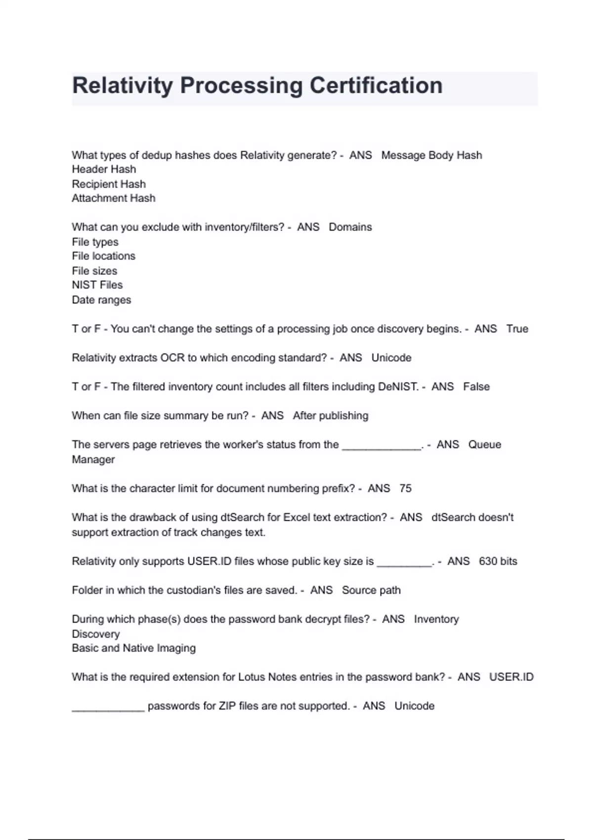 Relativity Processing Certification Exam Questions And Answers What types of dedup hashes does Relativity generate? - ANS Message Body Hash Header Hash Recipient Hash Attachment Hash What can you exclude with inventory/filters? - ANS Domains File types File locations File sizes NIST Files Date ranges T or F - You can't change the settings of a processing job once discovery begins. - ANS True Relativity extracts OCR to which encoding standard? - ANS Unicode T or F - The filtered inventory count includes all filters including DeNIST. - ANS False When can file size summary be run? - ANS After publishing The servers page retrieves the worker's status from the _____________. - ANS Queue Manager What is the character limit for document numbering prefix? - ANS 75 What is the drawback of using dtSearch for Excel text extraction? - ANS dtSearch doesn't support extraction of track changes text. Relativity only supports USER.ID files whose public key size is _________. - ANS 630 bits Folder in which the custodian's files are saved. - ANS Source path During which phase(s) does the password bank decrypt files? - ANS Inventory Discovery Basic and Native Imaging What is the required extension for Lotus Notes entries in the password bank? - ANS USER.ID ____________ passwords for ZIP files are not supported. - ANS Unicode What types of files are not supported by password bank? - ANS Encase files MS OneNote files What are the downfalls of using dtSearch for text extraction with Word and PowerPoint documents? - ANS Does not support extracting watermarks from pre-2007. Certain metadata fields not populated.