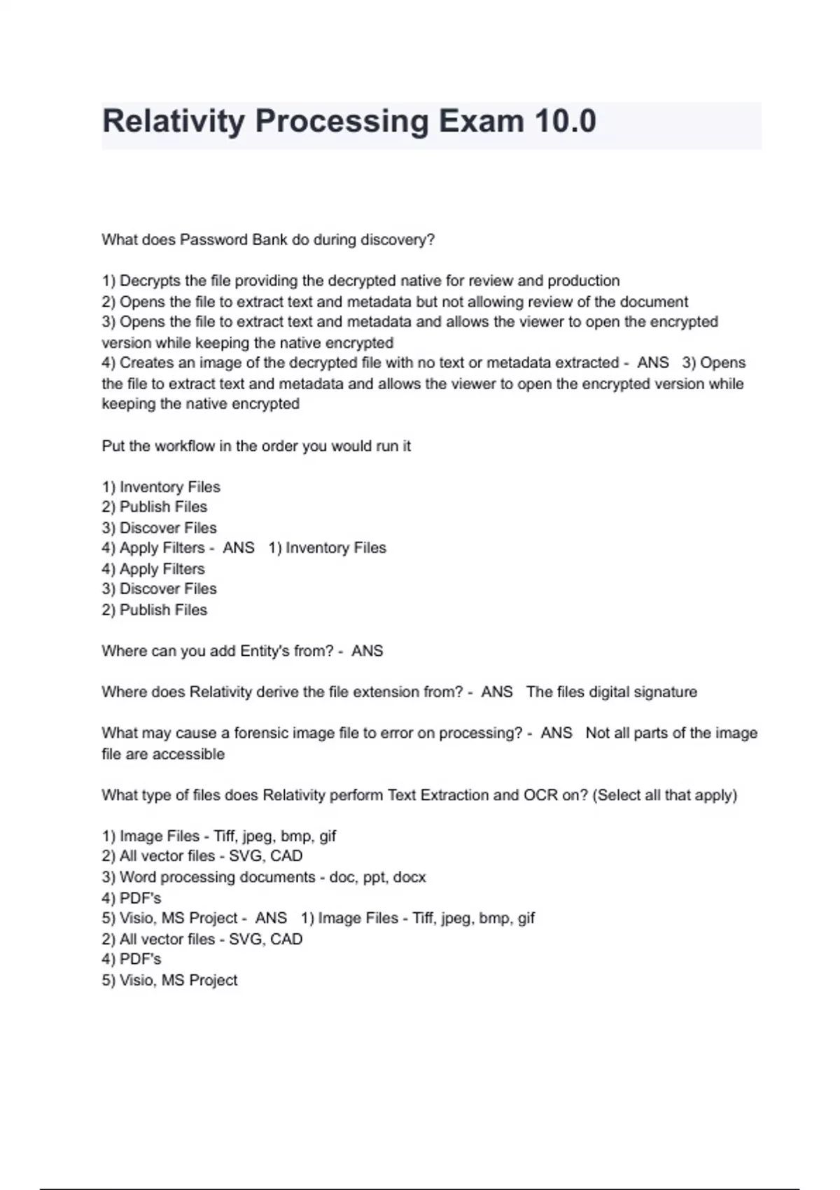 Relativity Processing Exam 10.0 Questions And Answers What does Password Bank do during discovery? 1) Decrypts the file providing the decrypted native for review and production 2) Opens the file to extract text and metadata but not allowing review of the document 3) Opens the file to extract text and metadata and allows the viewer to open the encrypted version while keeping the native encrypted 4) Creates an image of the decrypted file with no text or metadata extracted - ANS 3) Opens the file to extract text and metadata and allows the viewer to open the encrypted version while keeping the native encrypted Put the workflow in the order you would run it 1) Inventory Files 2) Publish Files 3) Discover Files 4) Apply Filters - ANS 1) Inventory Files 4) Apply Filters 3) Discover Files 2) Publish Files Where can you add Entity's from? - ANS Where does Relativity derive the file extension from? - ANS The files digital signature What may cause a forensic image file to error on processing? - ANS Not all parts of the image file are accessible What type of files does Relativity perform Text Extraction and OCR on? (Select all that apply) 1) Image Files - Tiff, jpeg, bmp, gif 2) All vector files - SVG, CAD 3) Word processing documents - doc, ppt, docx 4) PDF's 5) Visio, MS Project - ANS 1) Image Files - Tiff, jpeg, bmp, gif 2) All vector files - SVG, CAD 4) PDF's 5) Visio, MS Project At what stages can password bank decrypt files? (Select all that apply) 1) Inventory 2) Publishing 3) Native Imaging 4) Discovery - ANS 1) Inventory 3) Native Imaging 4) Discovery What tabs can Password Bank be found under? (Select all that apply) 1) Imaging Tab 2) Processing Tab 3) Production Tab 4) Case Admin Tab - ANS 1) Imaging Tab 2) Processing Tab How many passwords can you add to Password Bank? - ANS No limit, more than 100 could degrade performance What are the three password types you can enter into password bank? - ANS 1) Passwords 2) Lotus Notes 3) Email Encryption
