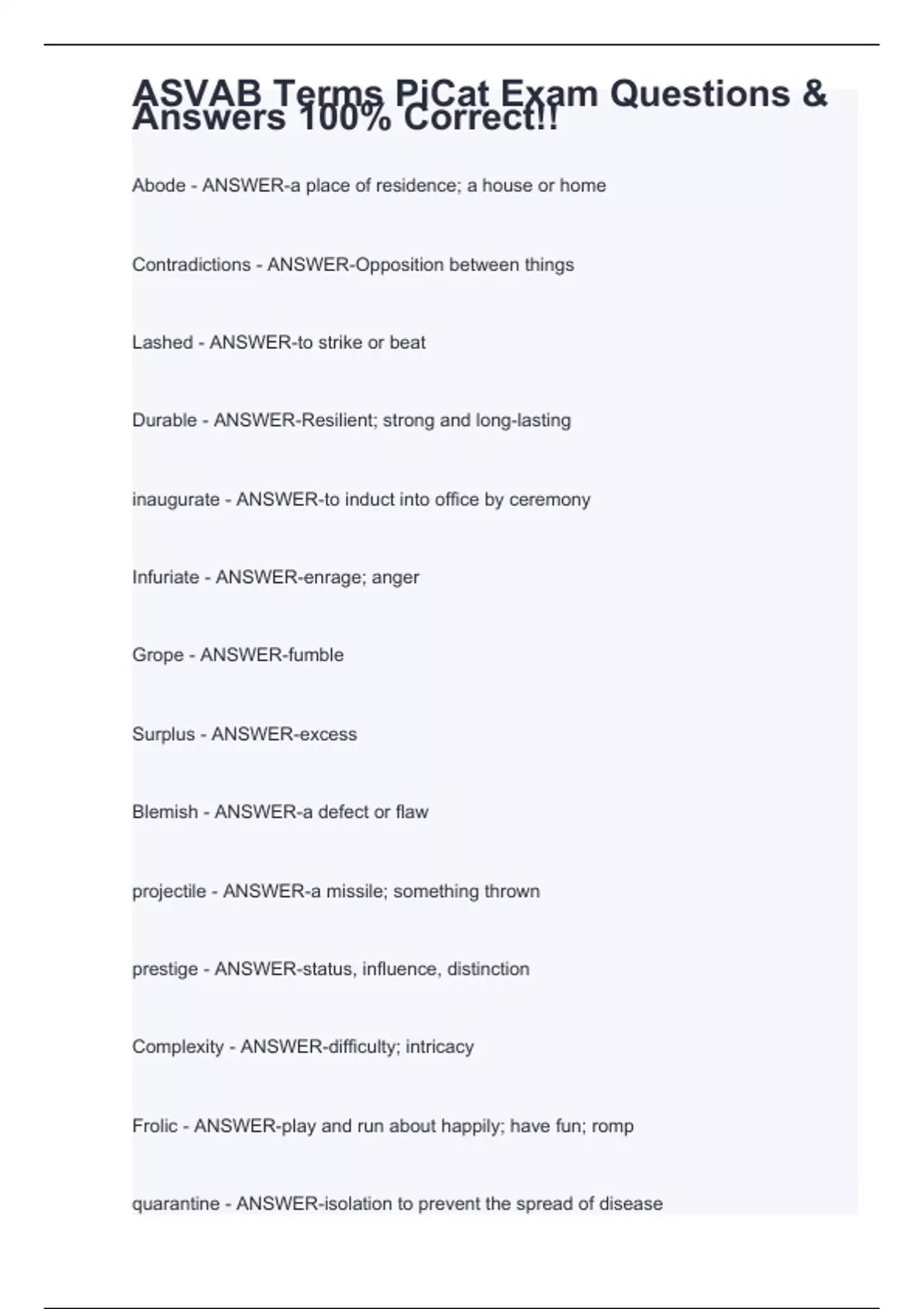 ASVAB Terms PiCat Exam Questions & Answers 100% Correct!!
