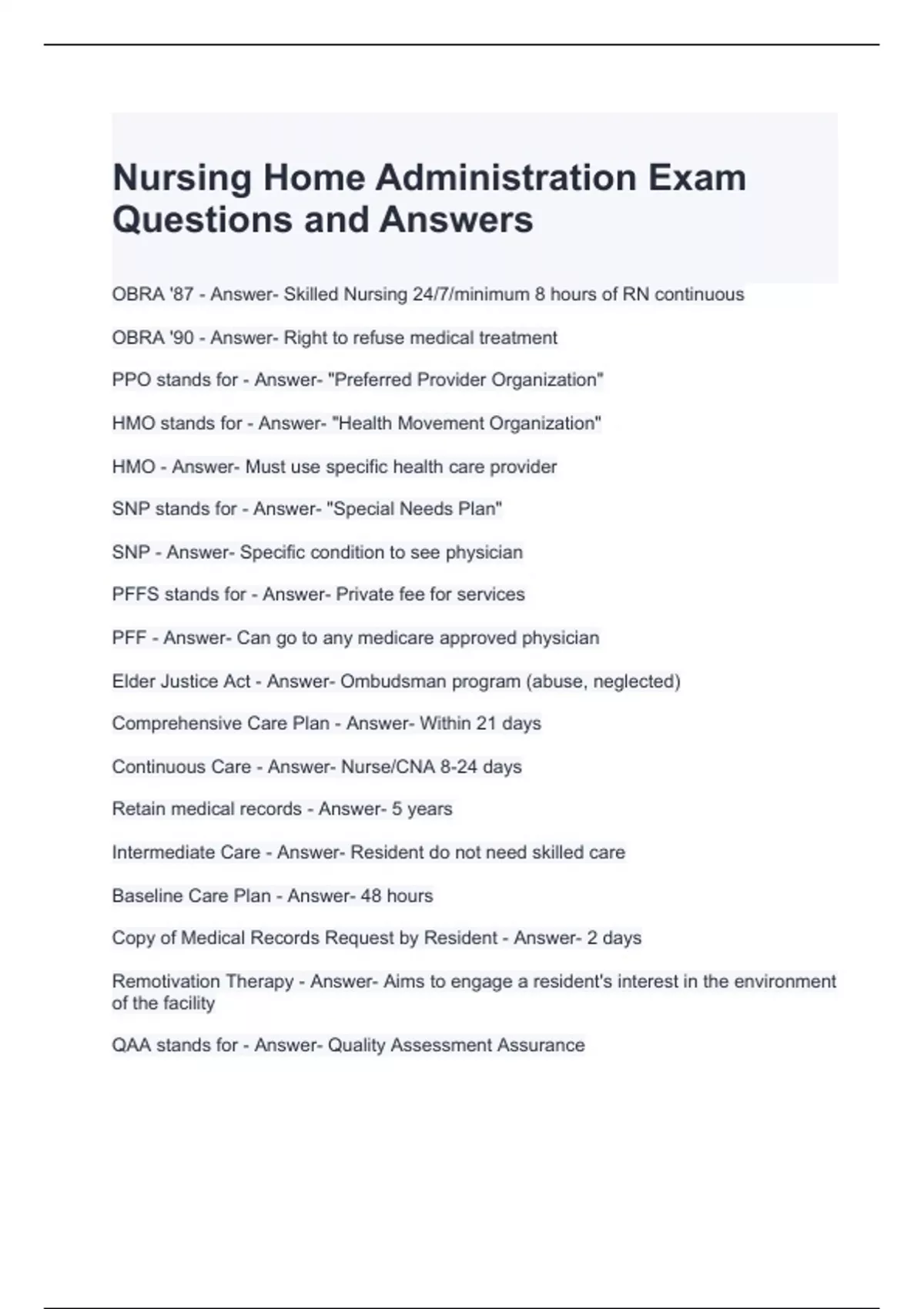 Nursing Home Administration Exam Questions and Answers
