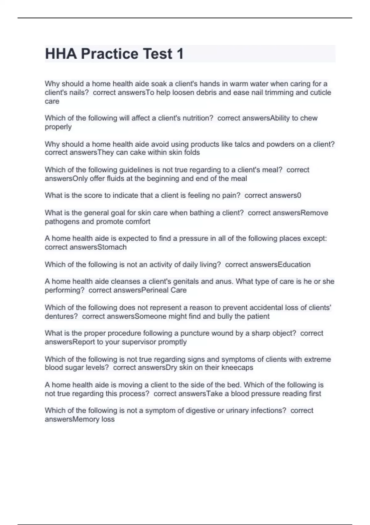 HHA Practice Test 1 with 100% correct choices 2024